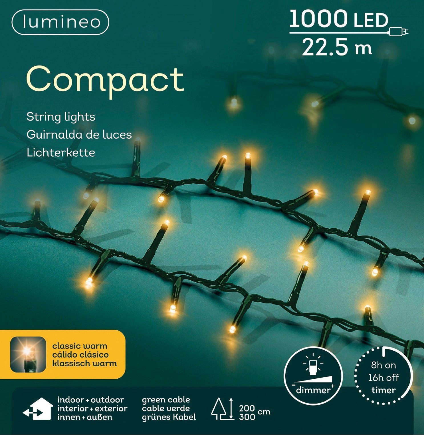 Die Lichterkette verfügt über 1.000 LEDs, welche in einem klassisch warmen Ton erstrahlen. Die 5 Stufen-Dimm-Funktion ermöglicht es, die Helligkeit nach Belieben anzupassen und somit die perfekte Atmosphäre zu schaffen. Dank der praktischen Timer-Funktion lässt sich die Lichterkette ganz bequem steuern, sodass sie automatisch 8 Stunden lang eingeschaltet und 16 Stunden ausgeschaltet ist. Diese Funktion spart nicht nur Energie, sondern sorgt auch dafür, dass die Lichterkette jeden Tag zur gleichen Zeit erstrahlt. Die Beleuchtung bietet zudem eine zusätzliche 5 m lange Zuleitung, wodurch die Lichterkette eine Gesamtlänge von 27,5 m besitzt. Mit dem IP44-Schutz ist sie Wetterbeständig und somit gegen Spritzwasser geschützt. Sie ist für den Innen- und Außenbereich geeignet. Für eine Baumhöhe von 200 - 300 cm geeignet. Mit CE-Gütesiegel ausgezeichnet. Das Kabel ist grün.