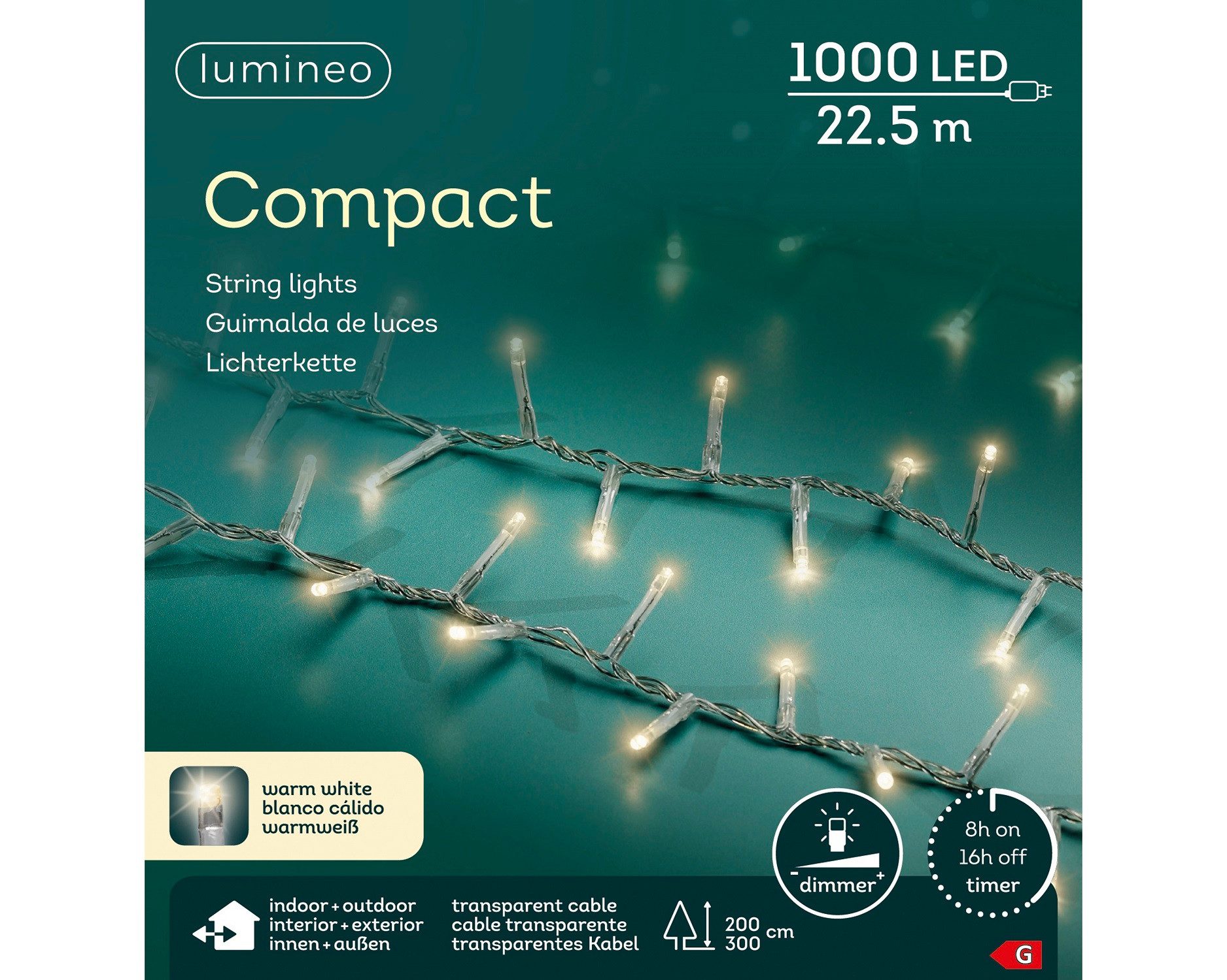 Die Lichterkette verfügt über 1.000 LEDs, welche in einem warm weißen Ton erstrahlen. Die 5 Stufen-Dimm-Funktion ermöglicht es, die Helligkeit nach Belieben anzupassen und somit die perfekte Atmosphäre zu schaffen. Dank der praktischen Timer-Funktion lässt sich die Lichterkette ganz bequem steuern, sodass sie automatisch 8 Stunden lang eingeschaltet und 16 Stunden ausgeschaltet ist. Diese Funktion spart nicht nur Energie, sondern sorgt auch dafür, dass die Lichterkette jeden Tag zur gleichen Zeit erstrahlt. Die Beleuchtung bietet zudem eine zusätzliche 5 m lange Zuleitung, wodurch die Lichterkette eine Gesamtlänge von 27,5 m besitzt. Mit dem IP44-Schutz ist sie Wetterbeständig und somit gegen Spritzwasser geschützt. Sie ist für den Innen- und Außenbereich geeignet. Für eine Baumhöhe von 200 - 300 cm geeignet. Mit CE-Gütesiegel ausgezeichnet. Das Kabel ist transparent.