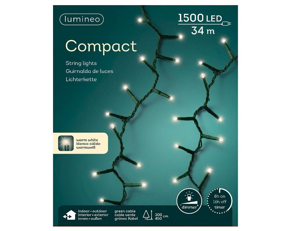 Die Lichterkette verfügt über 1.500 LEDs, welche in einem warm weißen Ton erstrahlen. Die 5 Stufen-Dimm-Funktion ermöglicht es, die Helligkeit nach Belieben anzupassen und somit die perfekte Atmosphäre zu schaffen. Dank der praktischen Timer-Funktion lässt sich die Lichterkette ganz bequem steuern, sodass sie automatisch 8 Stunden lang eingeschaltet und 16 Stunden ausgeschaltet ist. Diese Funktion spart nicht nur Energie, sondern sorgt auch dafür, dass die Lichterkette jeden Tag zur gleichen Zeit erstrahlt. Die Beleuchtung bietet zudem eine zusätzliche 5 m lange Zuleitung, wodurch die Lichterkette eine Gesamtlänge von 39 m besitzt. Mit dem IP44-Schutz ist sie Wetterbeständig und somit gegen Spritzwasser geschützt. Sie ist für den Innen- und Außenbereich geeignet. Für eine Baumhöhe von 300 - 450 cm geeignet. Mit CE-Gütesiegel ausgezeichnet. Das Kabel ist transparent.