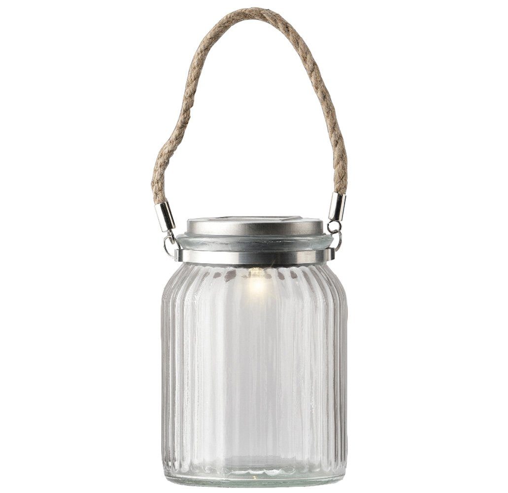 gerillte LED Solar Laterne in Einmachglas Form, mit Jute Griff und warm - weißem Licht, zum Hinstellen oder Aufhängen