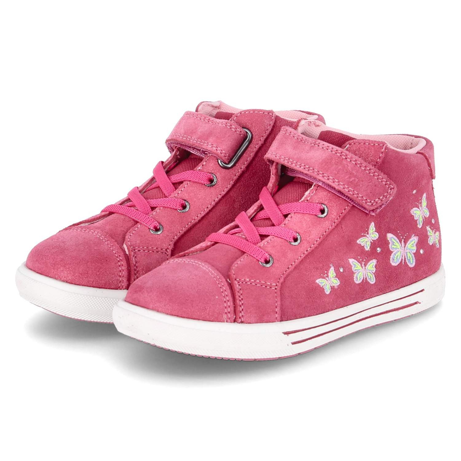 Die pinkfarbenen Klettboots von Lurchi aus weichem Rauleder sind liebevoll gestaltete Stiefeletten für aktive Mädchen. Ein Klettriemen in Kombination mit einem Elastikband in Schnüroptik sorgt für einen sicheren Halt und erleichtert das An- und Ausziehen. Seitlich aufgestickte Schmetterlinge verleihen dem Modell eine verspielte, kindgerechte Note. Der gepolsterte Einstieg bietet hohen Tragekomfort, während der verstärkte Fersenbereich für Stabilität sorgt. Das herausnehmbare Wechselfußbett ermöglicht eine einfache Reinigung oder den Einsatz eigener Einlagen. Die flexible, rutschhemmende Laufsohle unterstützt eine natürliche Abrollbewegung und sorgt für sicheren Halt – ideal für Alltag, Kindergarten und kleine Abenteuer. Ein bequemer und hübscher Schuh für kühlere Tage.