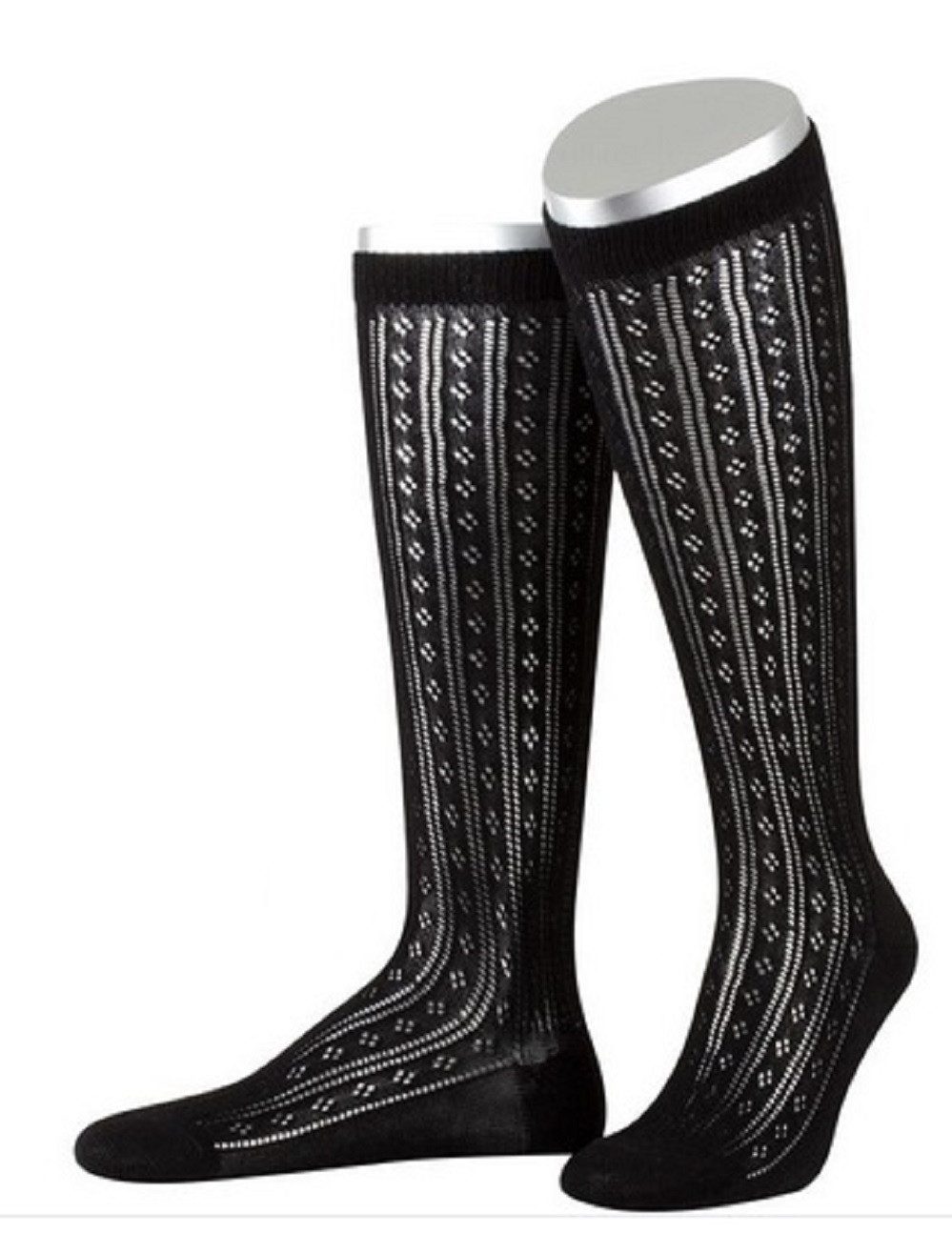 Damentrachten Kniestrumpf von LUSANA, Dirndlstrumpf in Baumwolle, besonders chic mit dem feinen Lochmuster in Spitzenform. Leicht glänzendes Material durch die Verwendung von 90% mercerisierter Baumwolle. Fersen- und Spitzenverstärkung. Die weiche Baumwolle garantiert ein besonders angenenehmes Tragegefühl und lange Haltbarkeit. Vielseitiger Damenstrumpf der zur Tracht, aber auch zu allen anderen Outfits passt. Komfortbündchen mit Elasthan Farbe weiß oder schwarz bis zu 40° waschbar