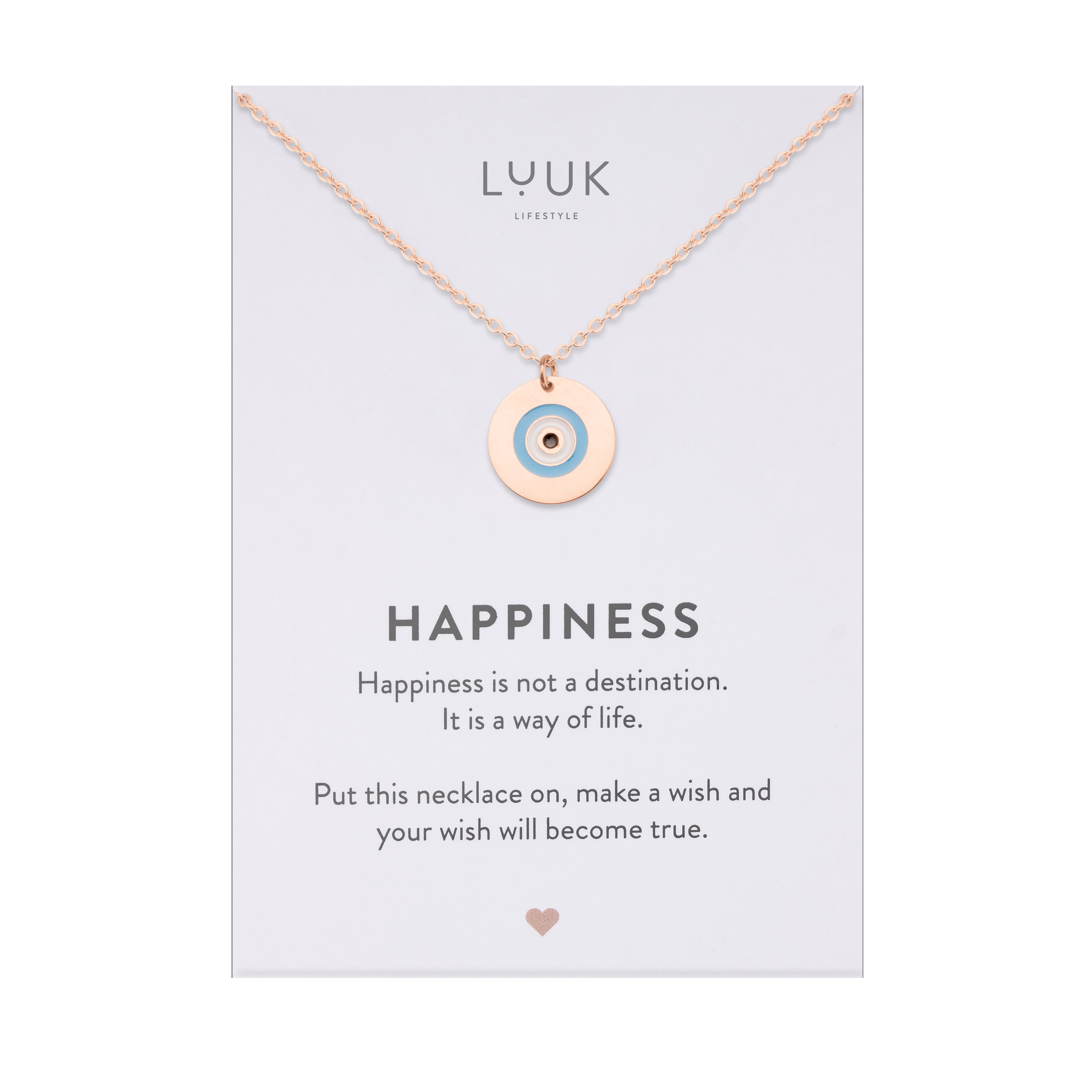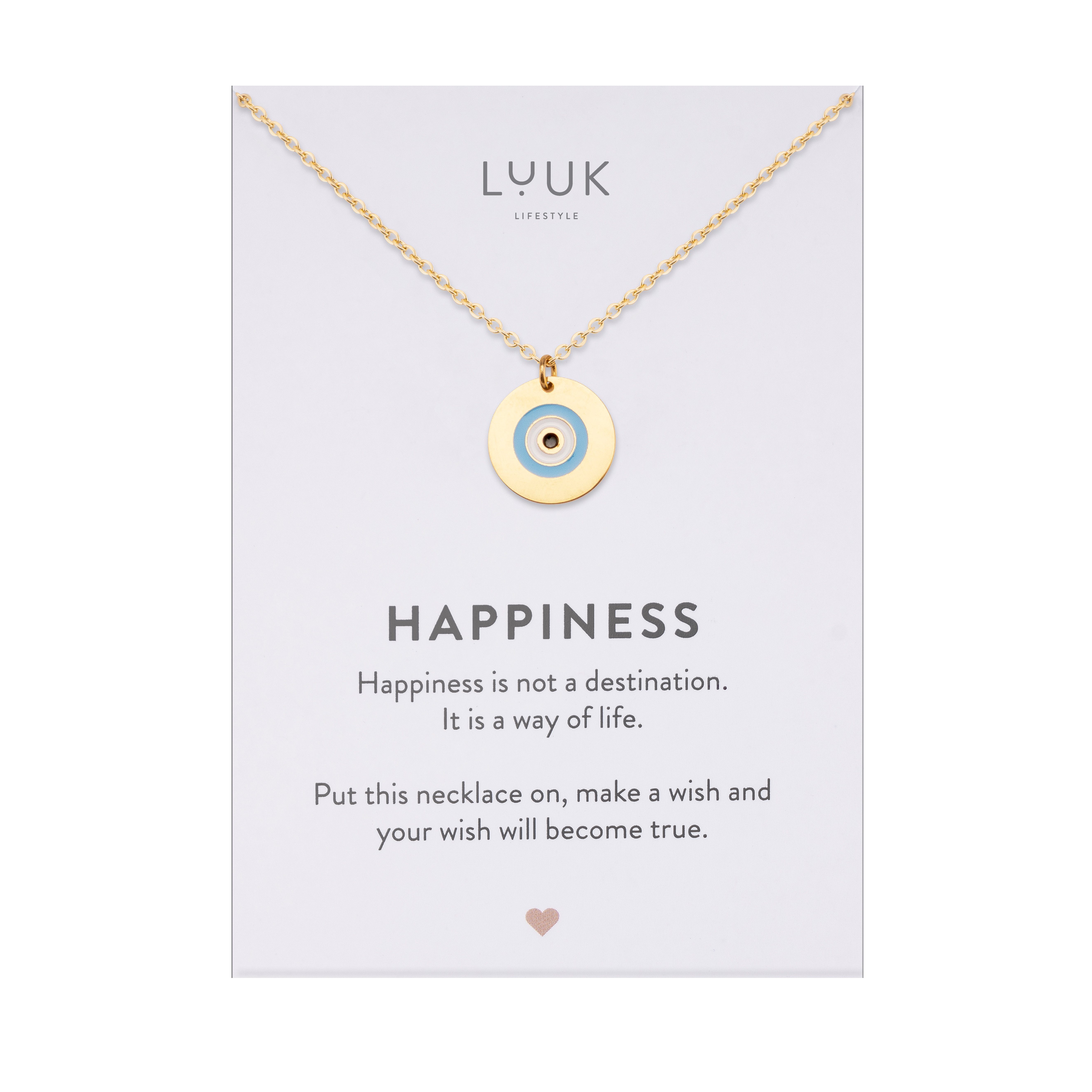 Filigrane Kette in schlichtem Design mit Evil eye Anhänger. Verfügbar in den Farben Gold, Silber und Roségold inklusive HAPPINESS Spruchkarte. Die Halskette wirkt feminin, stilvoll und ist vielseitig kombinierbar.