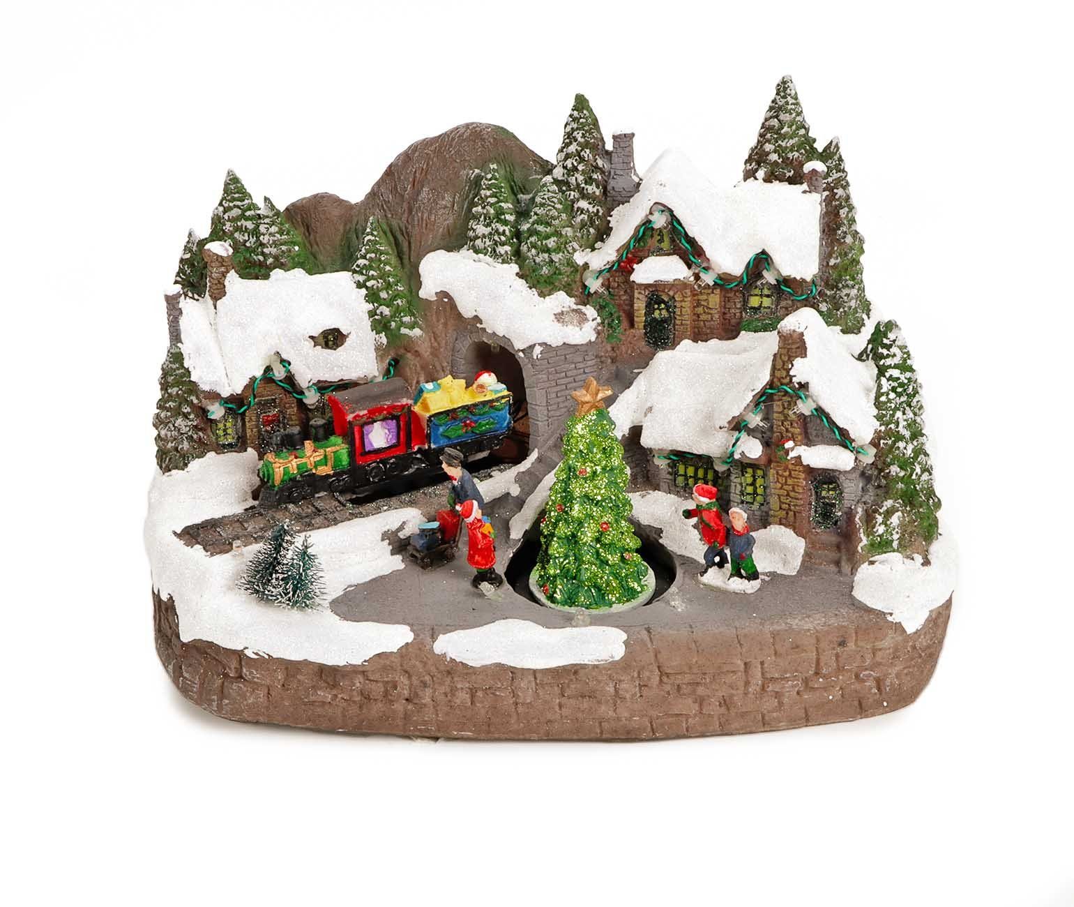 Lieferumfang | 1x Weihnachtsdorfplatz mit Zug aus Polyresin, beleuchtet von 18 multicolor LEDs 1x Versandkarton mit Betriebshinweisen |
