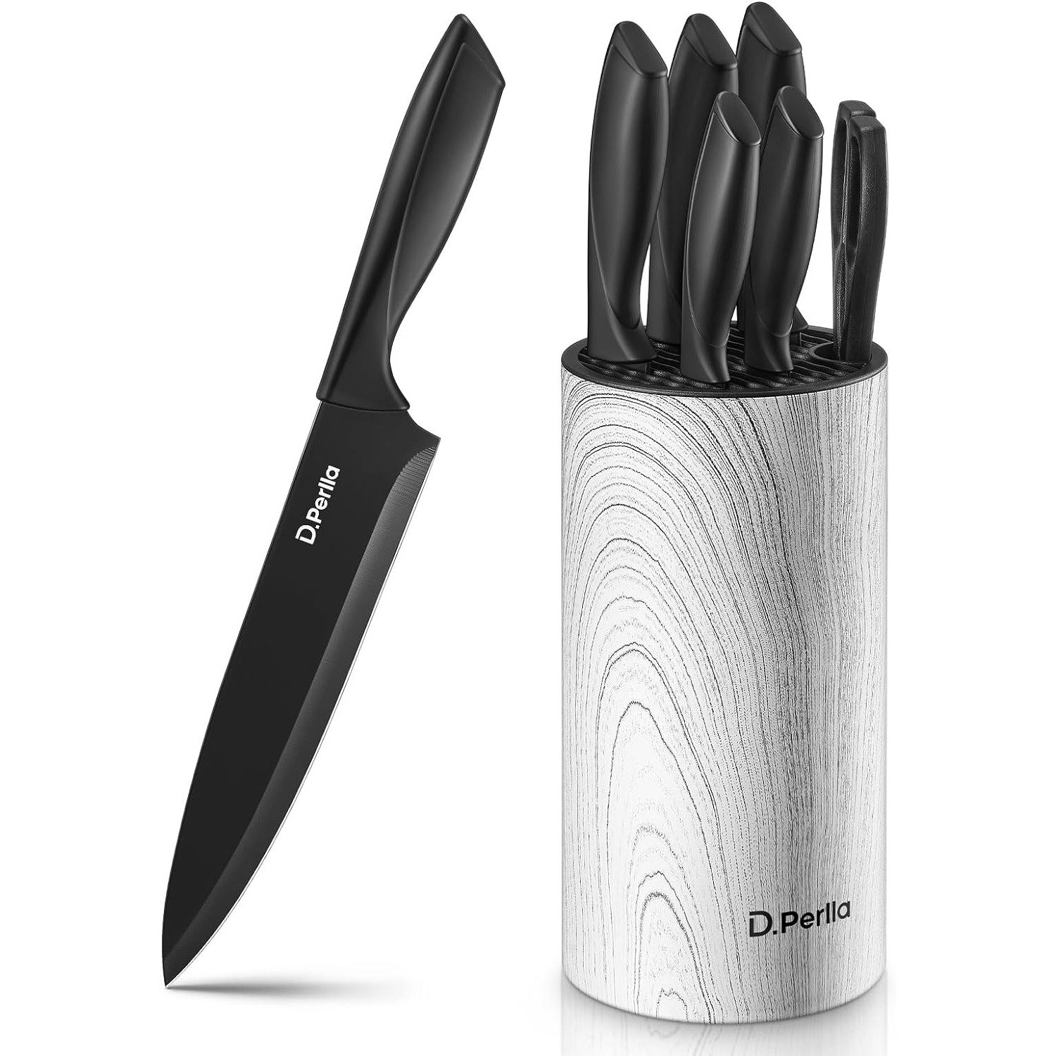 Das D.Perlla 7-TLG Messerblock mit Messer Set ist die perfekte Ergänzung für deine Küche. Dieses Set enthält ein Kochmesser (20cm), ein Brotmesser (20cm), ein Schnitzmesser (20cm), ein Universalmesser (13cm), ein Gemüsemesser (9cm), eine Küchenschere und einen Polypropylen Messerblock. Jedes Messer verfügt über eine 15° ultradünne Klinge aus Edelstahl, die extrem scharf und langlebig ist. Die schwarze Antihaftbeschichtung sorgt für Korrosions- und Rostbeständigkeit und verhindert, dass Lebensmittel an der Klinge haften bleiben.