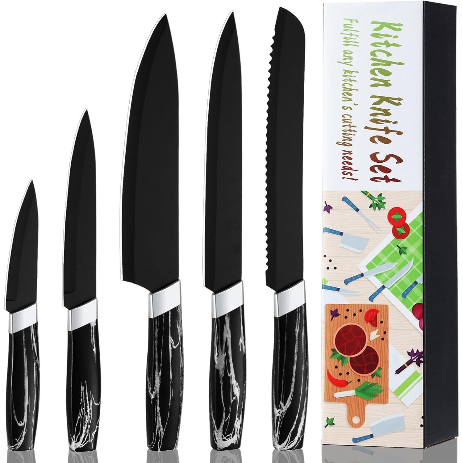 BESCHREIBUNG: Das BEWOS Messerset in Schwarz ist das ideale Werkzeug für leidenschaftliche Köche und Hobbyküchenchefs. Das 5-teilige Set beinhaltet ein Brotmesser (12,8 Zoll), ein Schneidemesser (12,8 Zoll), ein Kochmesser (12,4 Zoll), ein Gemüsemesser (9,1 Zoll) und ein Schälmesser (7,5 Zoll), die alle aus hochwertigem Edelstahl gefertigt sind und mit einer natürlichen schwarzen Titanbeschichtung versehen sind. Die Ultra scharfen Klingen sind rostbeständig und garantieren langanhaltende Schärfe für präzises Arbeiten in der Küche.