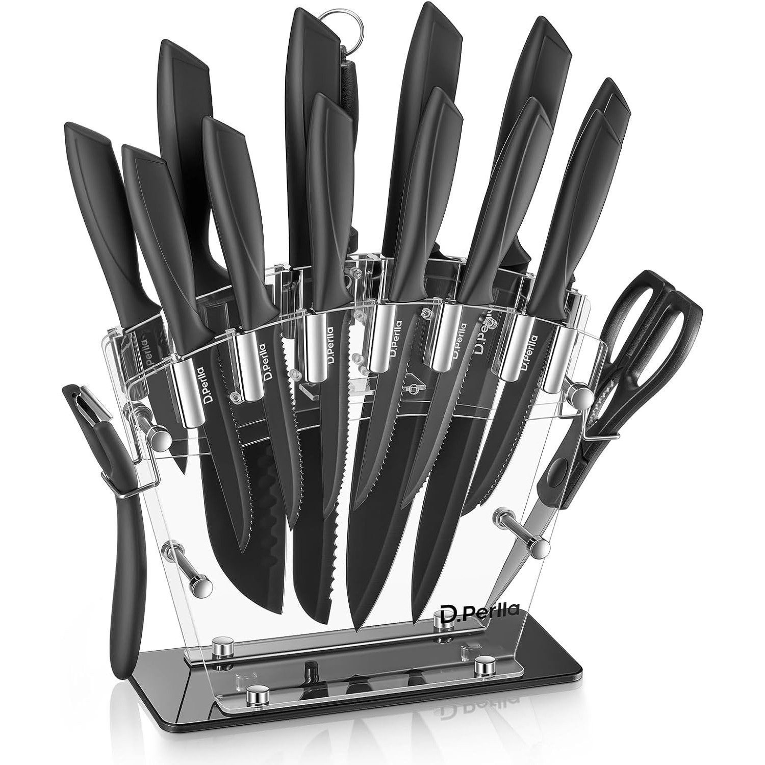 Messerblock, 16-TLG Messer set, Schwarz Antihaft-Beschichtung Messer mit Acryl Messerhalter, Edelstahl mit hohem Kohlenstoffgehalt Messer, Kein Rost, Super Scharf Messer