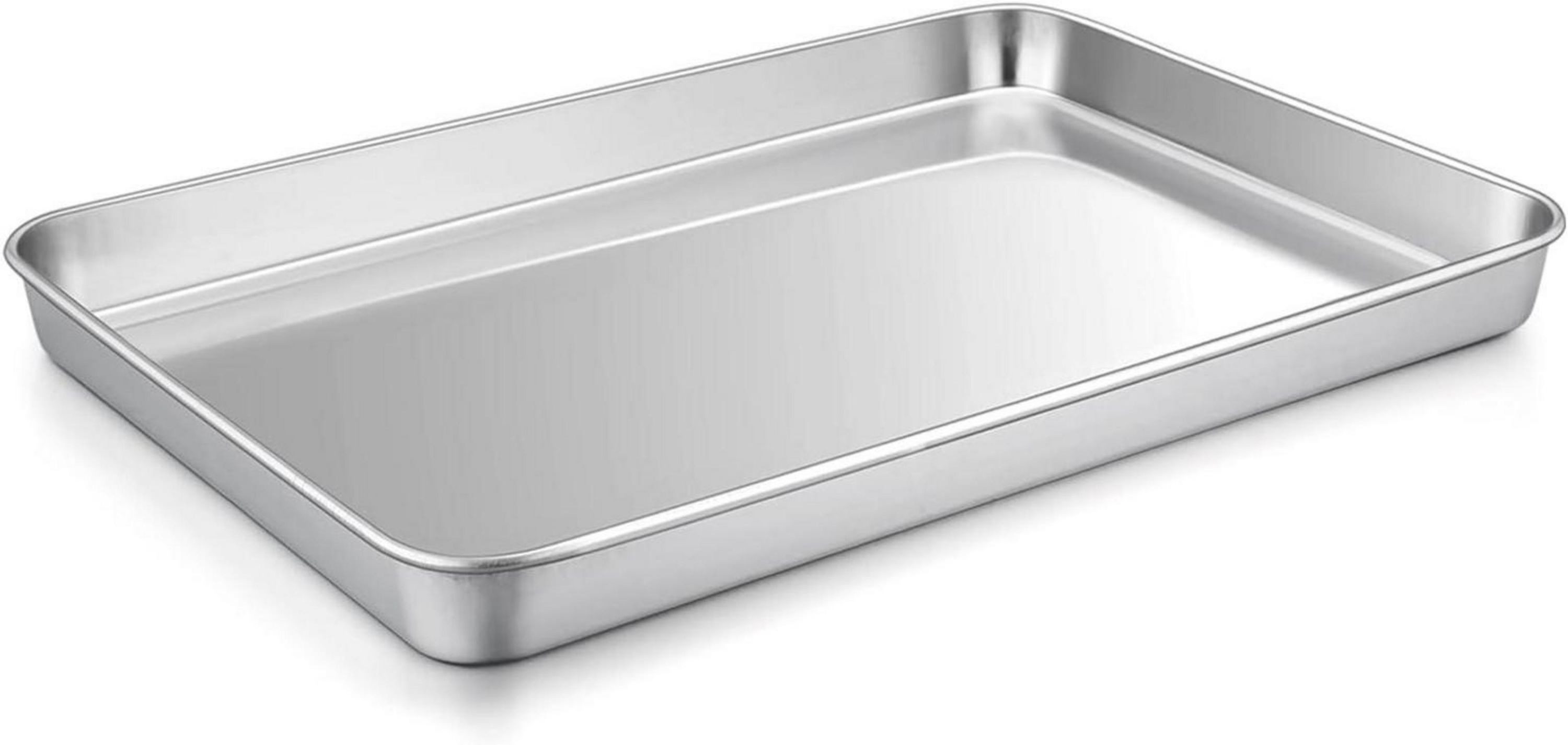 Exzellentes Design: Das rechteckige Kuchenblech verfügt über einen flachen Boden, der eine gleichmäßige Wärmeverteilung gewährleistet. Die runden Ecken und der glatte, gerollte Rand verhindern Kratzer und bieten einen sicheren Griff. Das robuste Edelstahlmaterial sorgt für eine lange Lebensdauer ohne Rostbildung.