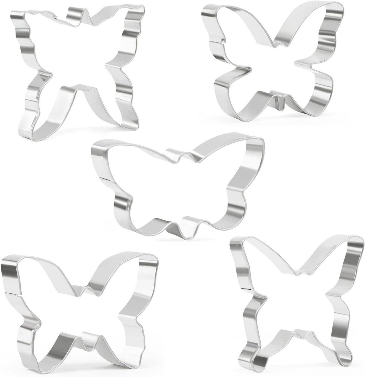 Das Keepaty 5 Stück Schmetterlings-Ausstecher-Formen-Set ist eine großartige Ergänzung für Ihre Backutensiliensammlung. Jede Form ist aus lebensmittelechtem Edelstahl, BPA-frei und 0,3 mm dick, was sie stark und langlebig macht. Die Размер der Formen variiert von etwa 5 cm bis 6,2 cm und ist perfekt für die Herstellung von Kuchendekorationen, Keksen, Gemüse-, Obst- oder Schokoladenformen.