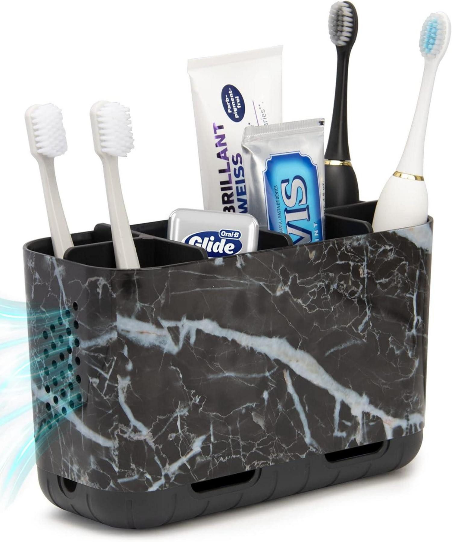 Der Zahnbürstenhalter in Schwarz mit Marmor-Muster ist nicht nur funktional, sondern auch ästhetisch ansprechend. Dieser Organizer verfügt über 6 Abteile, um verschiedene Badezimmerutensilien wie elektrische Zahnbürsten, Rasierapparate oder Kämme ordentlich zu verstauen. Mit der abnehmbaren Basis ist die Reinigung ein Kinderspiel, entweder per Hand mit Wasser oder sogar in der Spülmaschine. Der erhöhte Anti-Rutsch-Streifen sorgt für Stabilität, während die Abflüsse für eine gute Belüftung und Flüssigkeitskontrolle sorgen. Hergestellt aus lebensmittelechtem und langlebigem Material ist dieser Zahnbürstenhalter sowohl für Kinder als auch für Erwachsene geeignet. Die verstellbaren Trennwände ermöglichen es Ihnen, die Abteile Ihren Bedürfnissen anzupassen und den Organizer flexibel zu gestalten. Holen Sie sich jetzt diesen stilvollen und funktionalen Zahnbürstenhalter für eine ordentliche und organisierte Arbeitsfläche im Badezimmer!