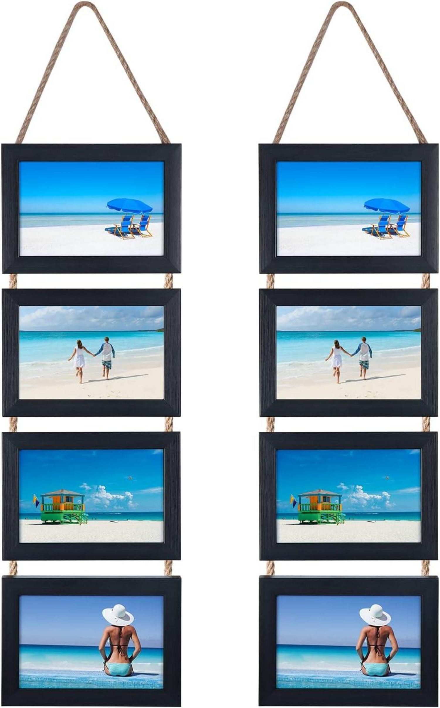 Jeder Bilderrahmen verfügt über eine Glasfront und robuste Schwenklaschen auf der Rückseite, um ein einfaches Laden und Austauschen von Bildern zu ermöglichen. Der horizontale Hängerahmen misst insgesamt 17,8 x 69 cm und verleiht Ihrem Raum ein rustikales Flair. Das an den Rahmen angebrachte Seil fügt eine einzigartige Note hinzu und ermöglicht es Ihnen, eine Collage aus 4 10x15 cm Fotos zu erstellen.