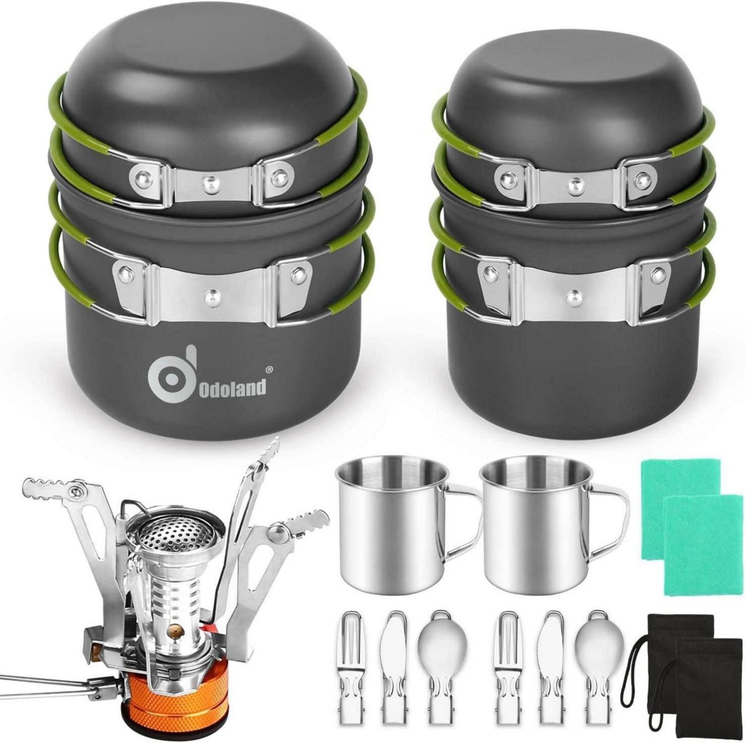 Genießen Sie das Kochen, wo immer Sie hingehen mit dem Odoland Camping Geschirr Set für 2 Personen. Dieses fantastische Kochgeschirrset ist super-portabel und eignet sich perfekt für Camping, Wandern, Rucksacktourismus, Picknick und andere Outdoor-Aktivitäten. Die klappbaren Griffe an Töpfen und Kocher machen das Set einfach zu transportieren und platzsparend zu verstauen. Hergestellt aus ungiftigem Aluminium und Edelstahl, ist jedes Teil robust, leicht und leitet die Wärme schnell.