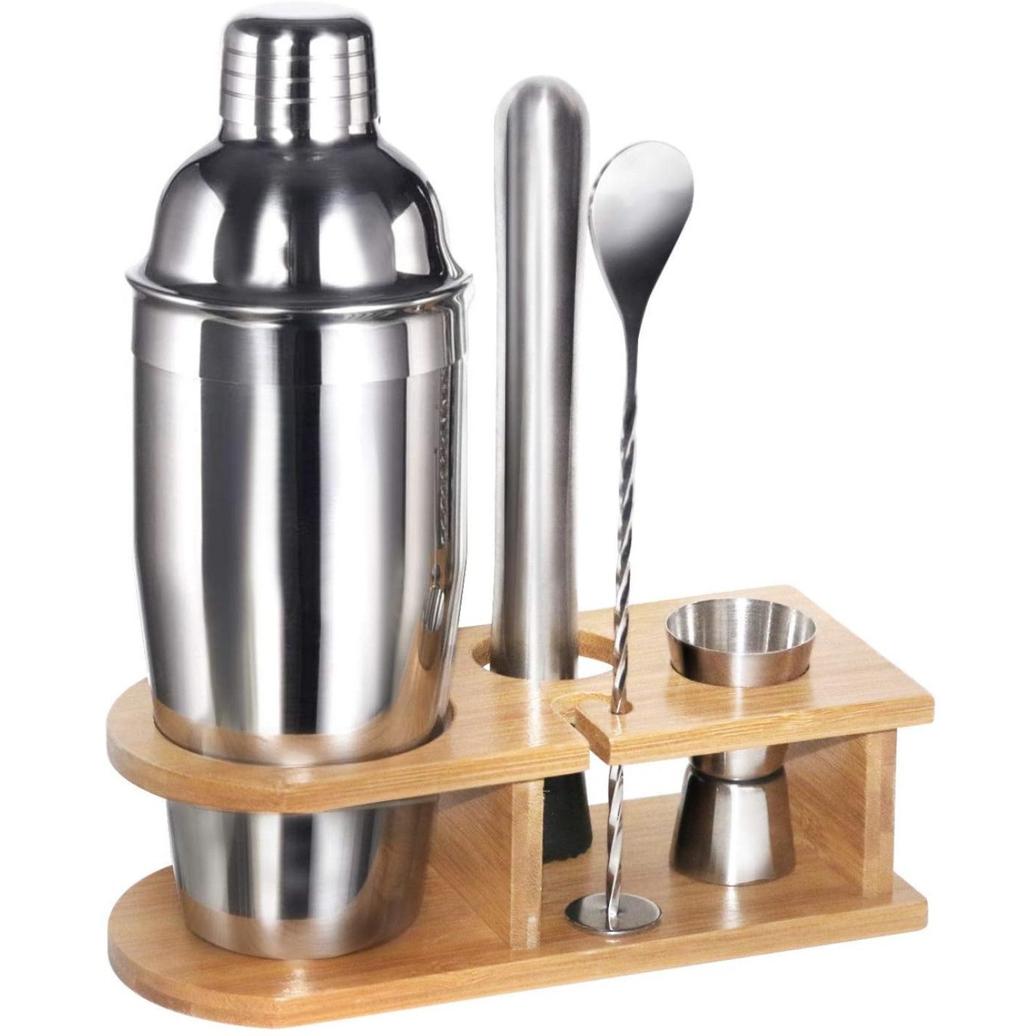 5-teiliges Barzubehör: Es bietet die wichtigsten Barkeeper-Werkzeuge, die Sie zum Mischen von köstlichen Cocktails benötigen, einschließlich 750 ml Cocktail-Shaker, 15/30 ml Doppel-Messbecher, Stößel, Löffel, Cocktail-Rezepteheft und stilvoller Holzständer. Kein unnötiges Barzubehör mehr, das Sie nie verwenden werden.
