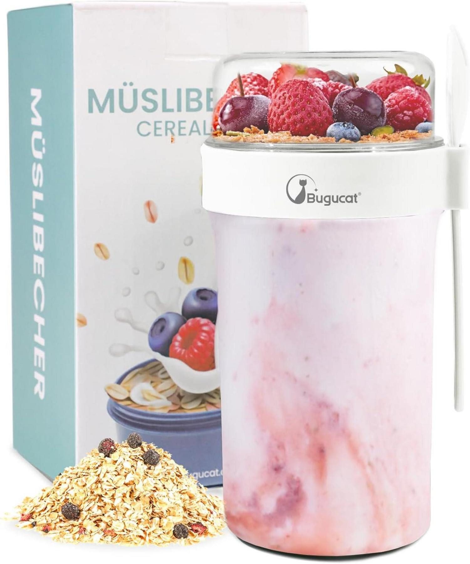 Der Müslibecher to go von Bugucat ist ein praktischer und vielseitiger Begleiter für unterwegs. Mit seinem innovativen Design und der hochwertigen Verarbeitung überzeugt er auf ganzer Linie.