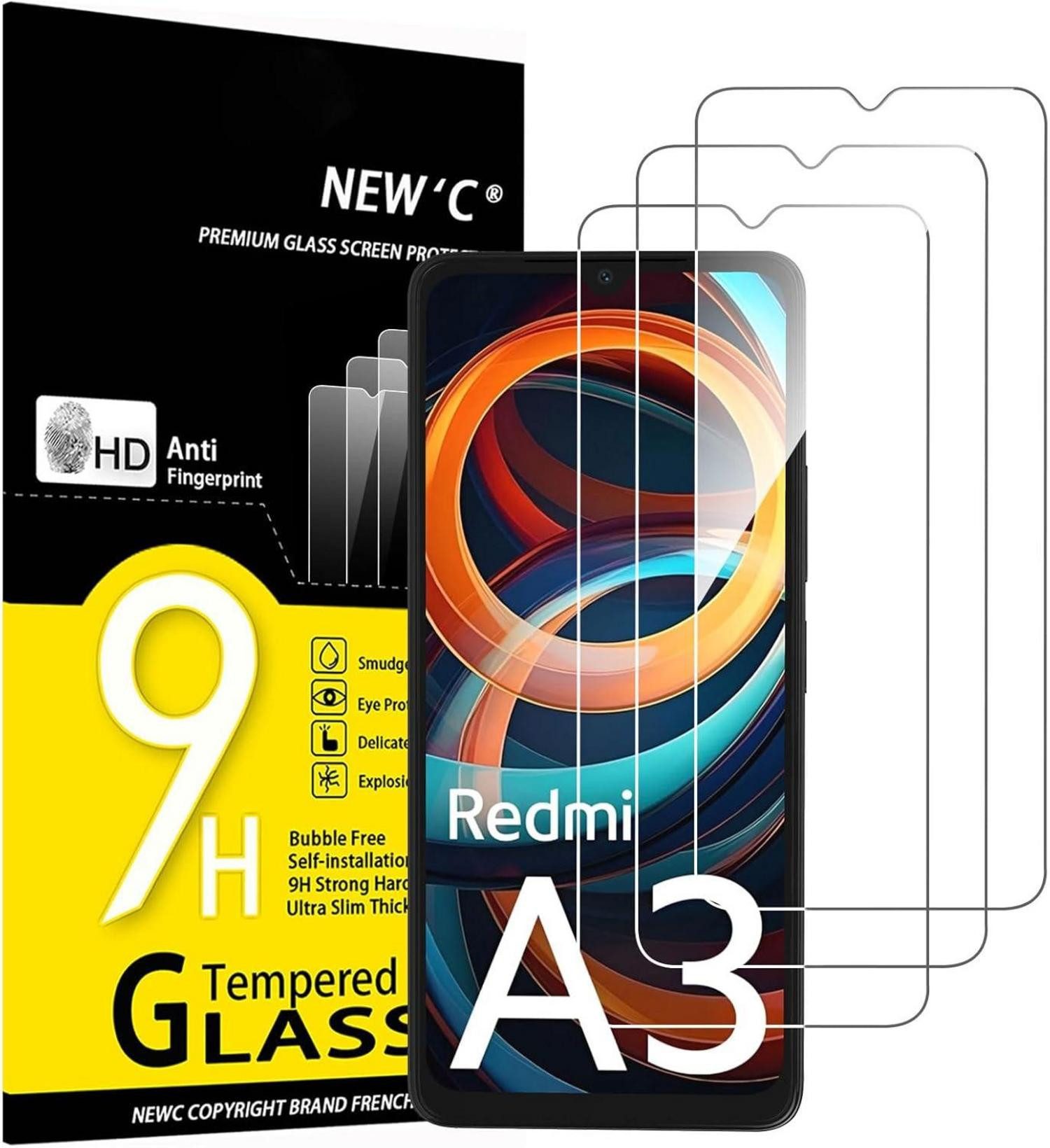 NEW'C Displayschutz aus Hartglas für Xiaomi Redmi A3 bietet einen effektiven Schutz für Ihr Smartphone-Display. Die 3 Stück Schutzfolie besteht aus 0,33 mm dickem Premium-Hartglas mit abgerundeten Kanten, das eine hervorragende Haltbarkeit gewährleistet. Die Silizium-Kleberbeschichtung ermöglicht eine einfache und blasenfreie Installation und bewahrt gleichzeitig die Berührungsempfindlichkeit des Touchscreens.