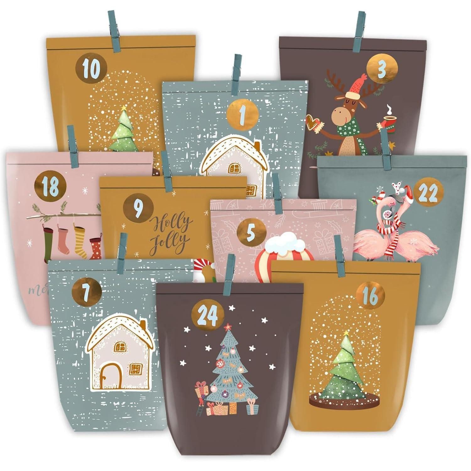 Dieses DIY Adventskalender-Taschen Bastelset begeistert Jung und Alt: Die 24 bedruckten Weihnacht-Motive, die 24 Kraftpapiertüten, die Zahlenaufkleber in Gold, und die passenden Holzklammern ermöglichen dir einen schnellen, liebevoll gestalteten Countdown. Die Tüten sind perfekt zum Selbermachen und lassen Raum für deine persönliche Note. Die Zahlenaufkleber 1–24 passen hervorragend zur Countdown-Funktion und machen jeden Tag zu einer kleinen Erinnerung an die schönste Jahreszeit. Dieses Set ist ideal zum Befüllen – PANSIBY Adventskalender zum Befüllen, 24 Weihnachtskalender Papiertüten zum Selber Basteln, Papier Adventstüten Bastelset mit Zahlenaufkleber Blau Rosa Gelb.