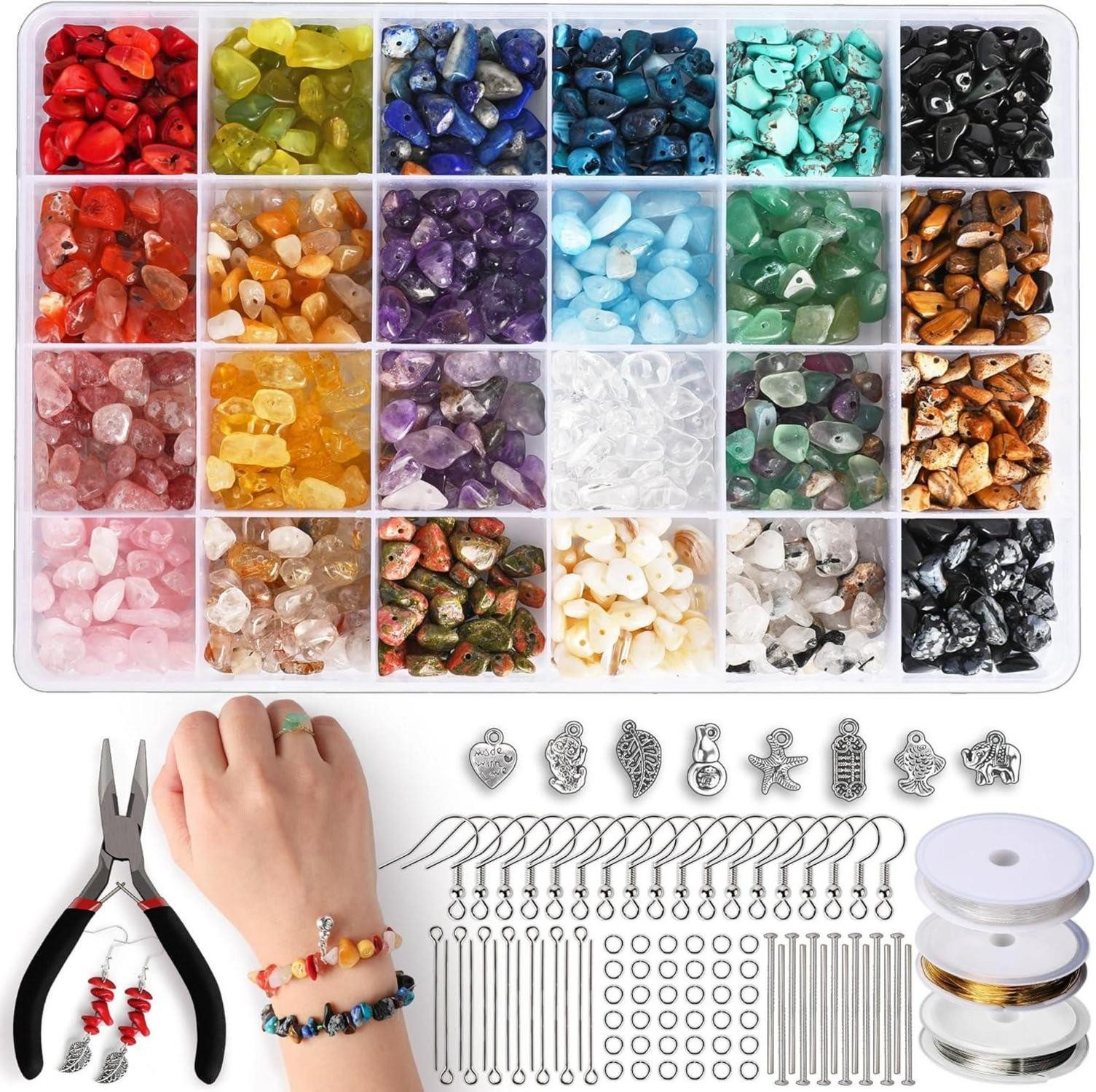 Das Set enthält 24 Arten von Chip-Edelstein Perlen, darunter Lapslazuli, Obsidian, Türkis, Rosenquarz, Amethyst und viele mehr. Jede Perle ist ein Unikat und verleiht Ihren Schmuckstücken eine besondere Note.
