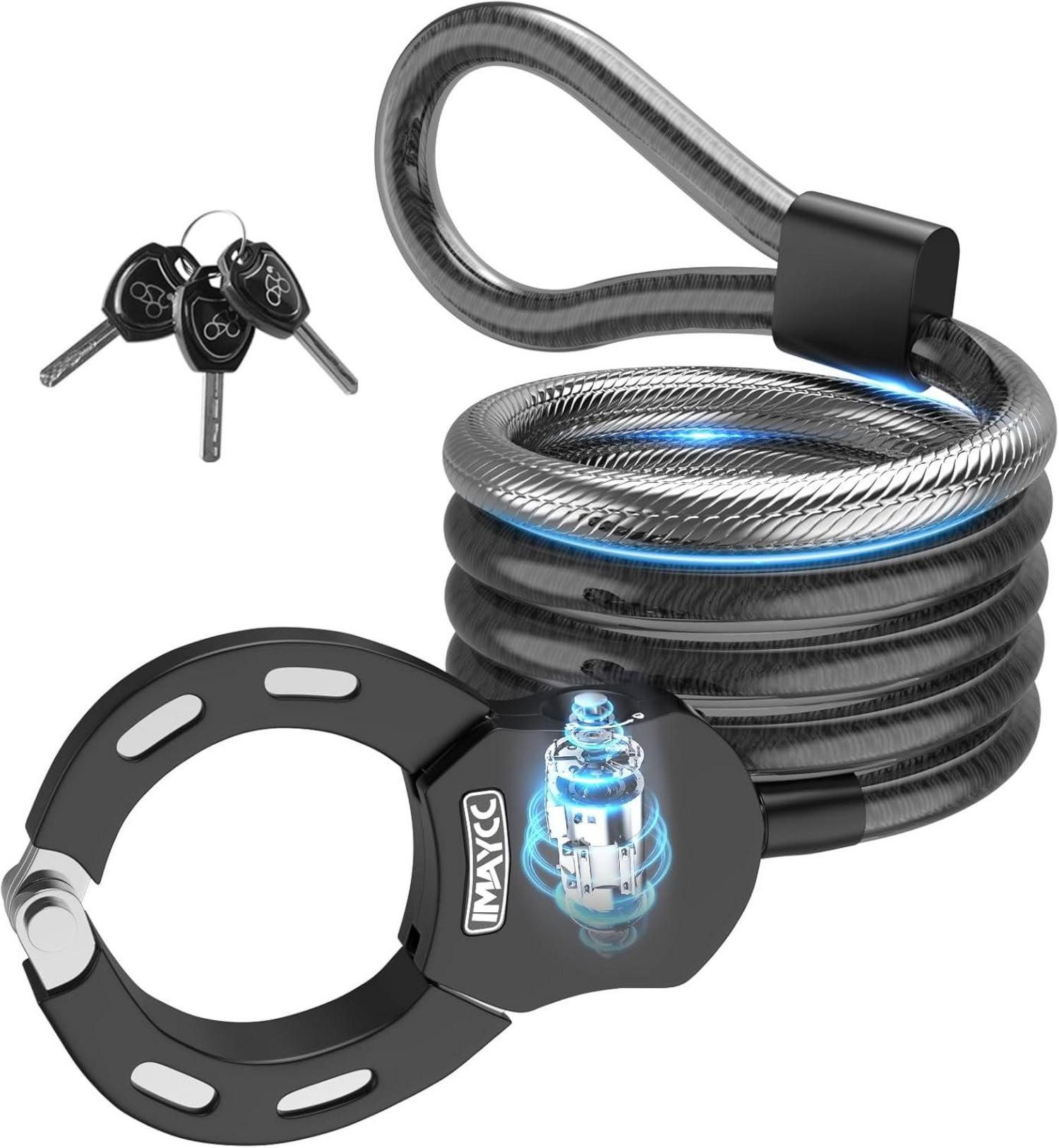 Das IMAYCC E Scooter Schloss mit Schlüssel ist die perfekte Wahl, um Ihren E-Scooter oder andere Wertgegenstände sicher zu halten. Mit seiner hohen Sicherheit und dem humanisierten Design bietet dieses Schloss den Schutz, den Sie benötigen, ohne dabei an Komfort zu verlieren. Das 14mm dicke Kabelschloss aus hochfestem geflochtenem Stahldraht ist pick- und bohrfest und kann 2,4KN Spannung und 7KN Scherkraft standhalten.