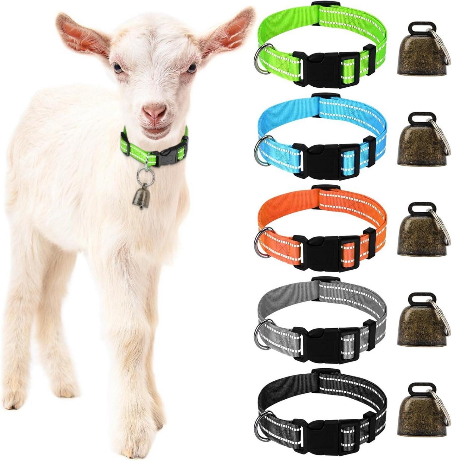 Das Mfsdai 5 Stück Reflektierend Ziegen Halsbänder mit Glöckchen sind das perfekte Accessoire für Ihre Nutztiere. Jedes Set enthält 5 Halsbänder in verschiedenen Farben (schwarz, orange, hellblau, grün, grau), jeweils mit einer Glocke und einem Schlüsselring. Diese Halsbänder sind nicht nur funktional, sondern auch ein nettes Geschenk für Tierhalter.