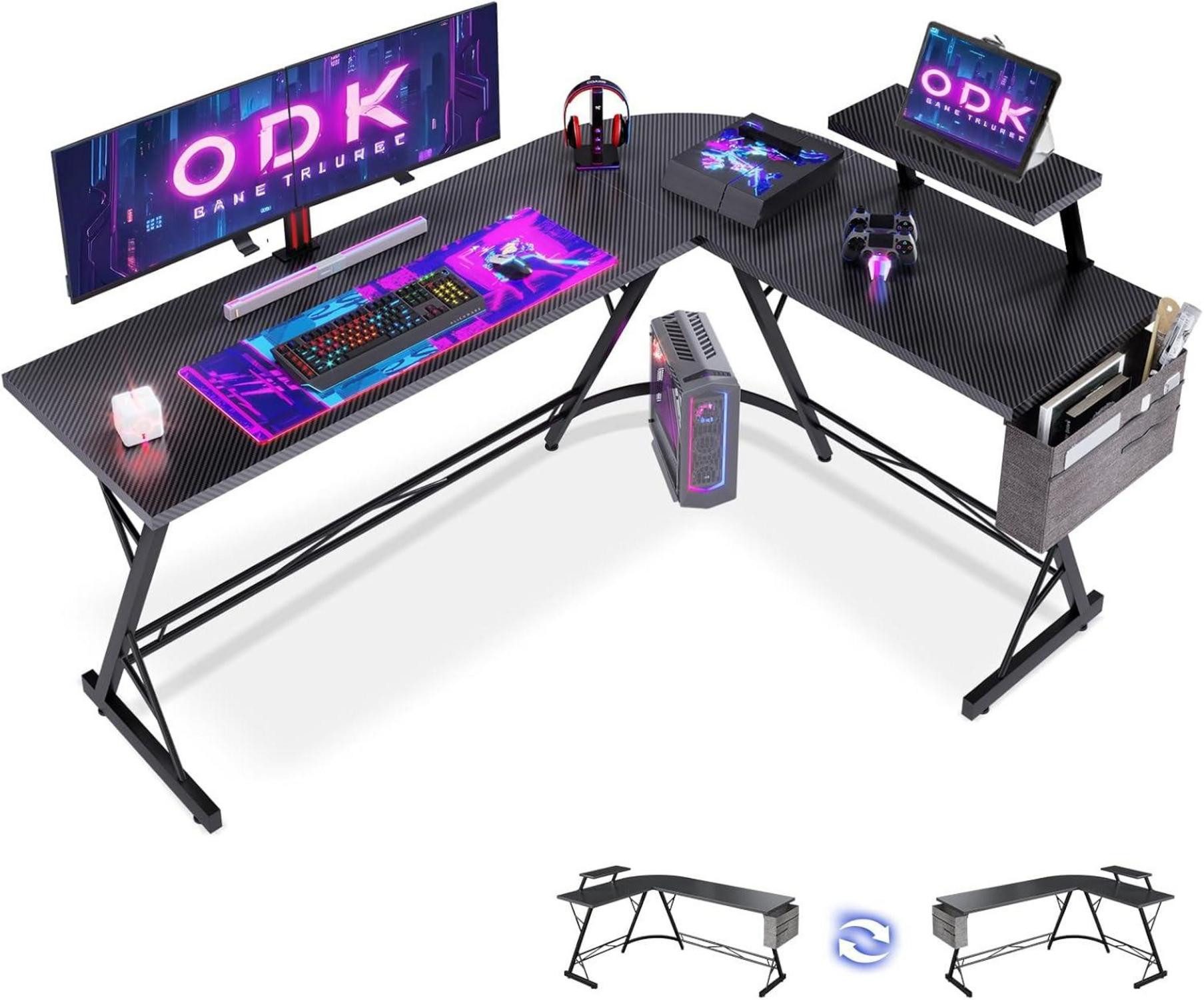 Unser ODK Gaming Tisch in Carbon Schwarz bietet Ihnen eine geräumige Arbeitsfläche von 167 x 120 cm, die eine effiziente und komfortable Arbeit ermöglicht. Der L-förmige Schreibtisch ist ideal für Gamer und Büroarbeiter gleichermaßen. Die integrierten Monitorständer sorgen für eine optimale Bildschirmpositionierung und fördern eine gesündere Sitzhaltung, um Verspannungen vorzubeugen. Die robuste und stabile Konstruktion gewährleistet eine lange Lebensdauer und Zuverlässigkeit im täglichen Gebrauch.