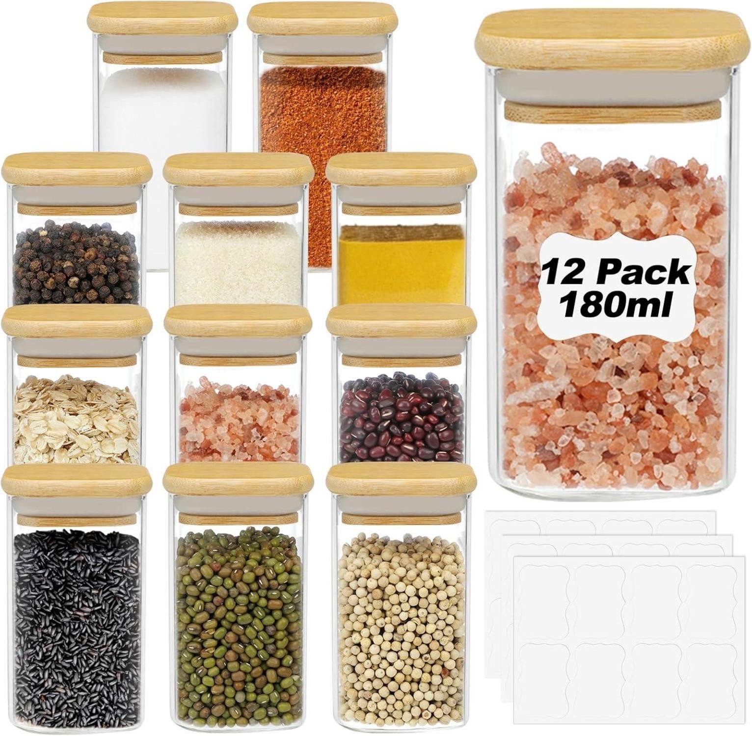 YUEYEE Gewürzgläser Eckig mit Deckeln und Etiketten sind die Lösung für alle, die Wert auf Ordnung und stilvolle Aufbewahrung legen. Dieses Set besteht aus 12 kleinen Gewürzbehältern mit einem Fassungsvermögen von 6 oz/180 ml, Bambusdeckeln und Etiketten für die individuelle Beschriftung.
