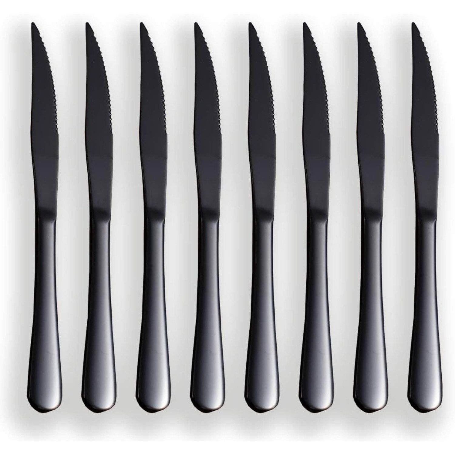 Schwarzes Steakmesser-Set, Schwarzes gezahntes Messer, Titanschwarzes Edelstahl-Scharfmesser-Set, Tafelmesser-Set von 8, Spülmaschinenfest, robust und leicht zu reinigen Packung mit 8-teiligem Steakmesser-Set aus hochwertigem Edelstahl mit scharfen, gezahnten Klingen, die Fleisch leicht schneiden. Dieses erstklassige Steakmesserset besteht aus rostfreiem Edelstahl, der spülmaschinenfest und einfach zu reinigen ist. Mit seinem klassischen Design, robusten Griffen und hochglänzender Politur ist dieses Set nicht nur funktional, sondern auch ästhetisch ansprechend. Das Titanschwarz-Finish verleiht den Messern eine edle Optik, die auf jeder Tischdekoration beeindruckt. Egal ob für den täglichen Gebrauch zuhause, beim Grillen im Freien oder für besondere Anlässe wie Partys, Hochzeiten oder Feierlichkeiten, dieses Steakmesser-Set passt perfekt zu jedem Anlass.