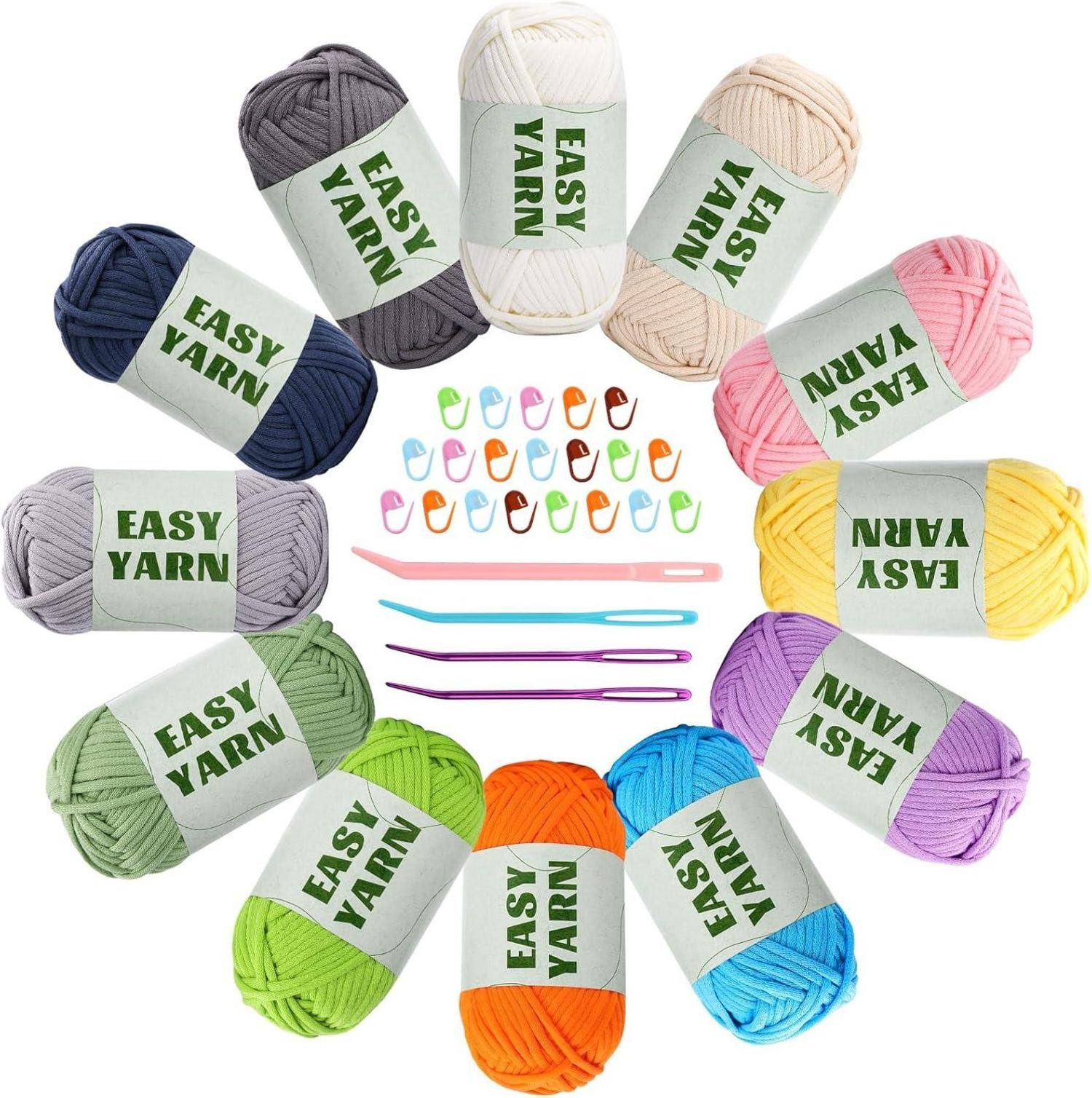 Zusätzlich zu den 12 Knäueln enthalten ist ein praktisches Set aus 20 Maschenmarkierern in zufälligen Farben sowie 2 Hakennadeln aus Kunststoff und 2 Hakennadeln mit großem Öhr. Diese Häkelzubehörteile erleichtern das Koordinieren und Gestalten Ihrer Projekte.
