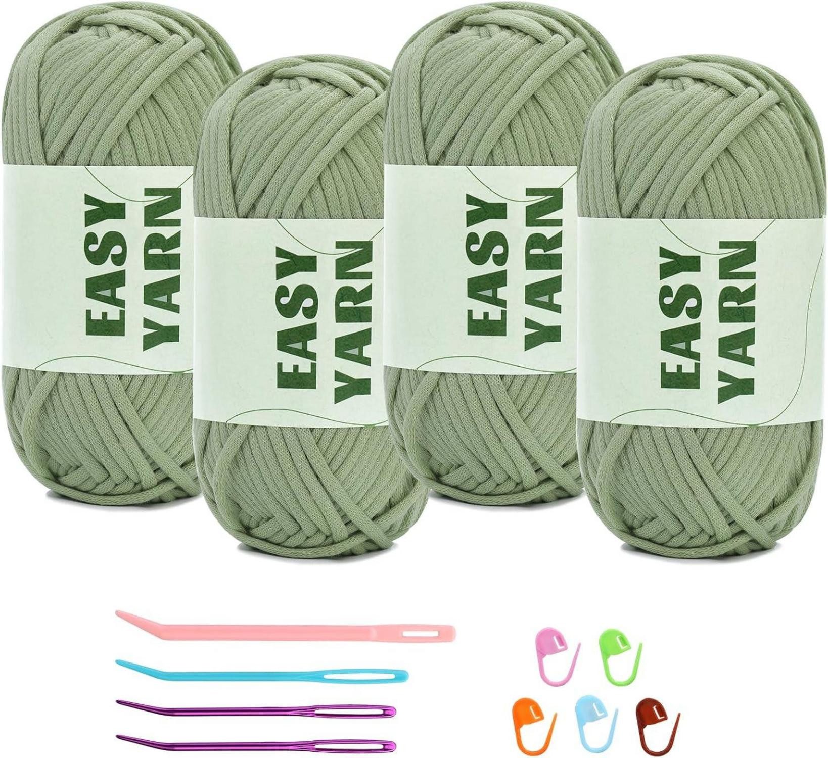 ERWEITERTE BESCHREIBUNG: Dieses hellgrüne Garn-Set besteht aus 4 Stücken grobem, dickem Baumwoll-Nylon-Mischgarn mit jeweils 50 g. Es bietet eine mäßige Elastizität und Weichheit, ideal für Anfänger und erfahrene Häkelfans. Das Garn eignet sich perfekt für Projekte wie Schals, Kleidung, Decken und verschiedene Wohnaccessoires. Durch die hohe Sichtbarkeit der Maschen und das erstklassige Finish erhalten Sie wunderschöne Häkelarbeiten. Zusätzlich zum Garn erhalten Sie 5 Maschenmarkierer in zufälligen Farben, 2 Hakennadeln aus Kunststoff und 2 Hakennadeln mit großem Öhr – alles, was Sie zum Häkeln benötigen. Die über 20 verfügbaren Farben bieten Ihnen endlose Möglichkeiten zur Kreation einzigartiger Stücke. Hergestellt aus hochwertigen Materialien, bricht oder franst dieses Premium-Garn nicht aus. Mit einer Длина von 87,5 Yards pro Stück können Sie lange Zeit kreativ sein. Es ist maschinen- und handwaschbar, was die Pflege erleichtert. Nutzen Sie dieses Garn-Set, um Ihre Häkelkünste zu perfektionieren und stilvolle Handarbeiten anzufertigen. Beginnen Sie Ihr nächstes Projekt mit Vertrauen und Kreativität dank dieses hochwertigen Häkel- und Strickgarns.
