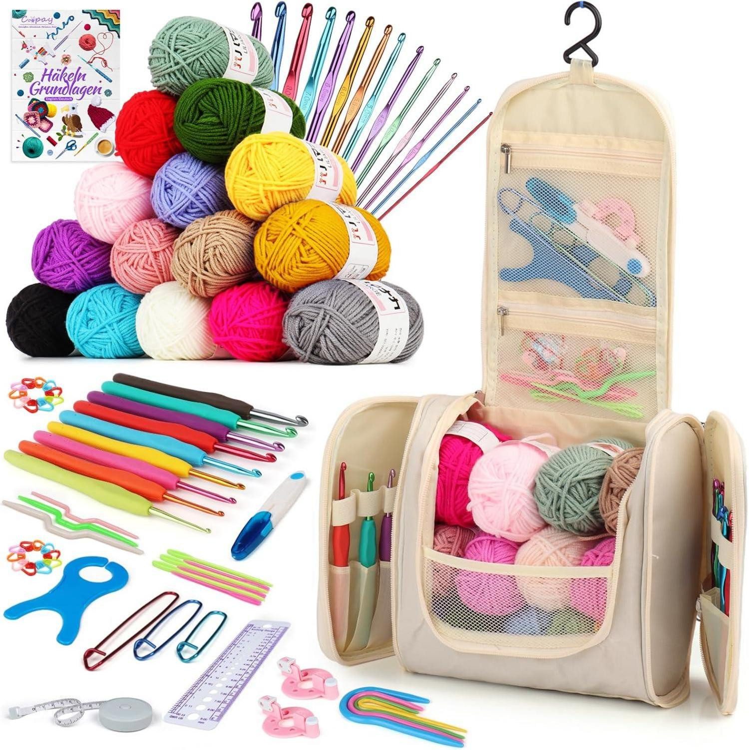 Komplettes Häkelset für Anfänger: Das Set enthält 14 Metall Häkelnadeln, 9 Häkelnadeln mit TPR Griff, 15 farbige Häkelgarne, 20 Maschenmarkierer, 6 Kunststoff Nähnadeln, 3 Zopfnadel Stricknadeln, 4 U-förmige Stricknadeln, 1 Garnspule, 1 Maßband, 3 Stichhalter, 1 Schere, 2 Pompom Maker, 1 Nadellehre, 1 Anleitung und 1 Tragbare Tasche. Es ist besonders geeignet für Häkelanfänger, die ihre Häkelreise beginnen möchten.
