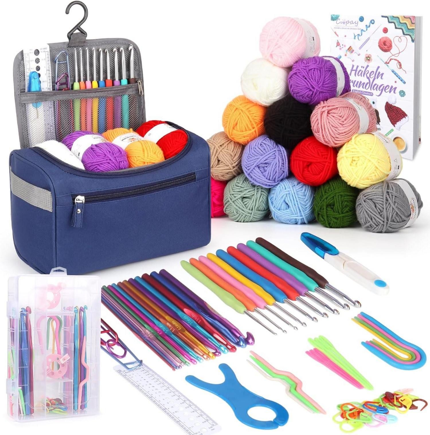 Enthält eine Vielzahl von Wollfarben, damit Sie direkt mit Ihrem Projekt beginnen können. Das Set umfasst auch 23 Häkelnadeln (2,0–10 mm), eine transparente Aufbewahrungsbox, eine praktische Handtasche und weiteres Häkelzubehör.