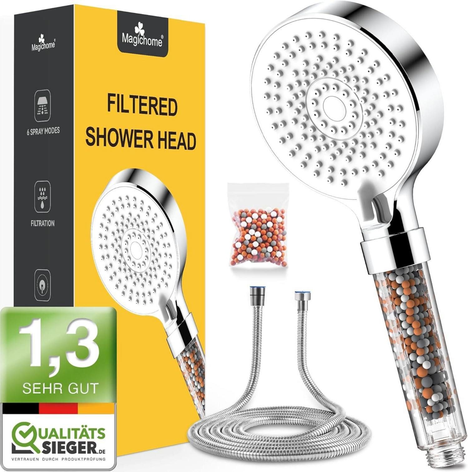 Hochdruck-Duschkopf - Dieser leistungsstarke Duschkopf verwendet eine Luftdrucktechnologie, die den Wasserdruck erhöhen kann. Mit dichtem und kraftvollem Wasser bietet es Ihnen ein Regenerlebnis mit vollständiger Abdeckung. Sie werden alle Probleme der herkömmlichen Duschköpfe los und genießen eine gesunde Regendusche.5 Modi Duschkopf - Dieser leistungsstarke Duschkopf hat 5 verschiedene Sprühmodi, um Ihre unterschiedlichen Duschbedürfnisse zu erfüllen. Jeder Modus ist ein anderes Duscherlebnis.Antiblockierender Filter-Duschkopf - Im Vergleich zu anderen gewöhnlichen Filterduschköpfen ist der neueste Filterduschkopf von Magichome mit der Antikalk-Silikondüse ausgestattet, die die Kalkablagerungen verhindert und leicht zu reinigen ist. Es wird Ihnen ein besseres Nutzungserlebnis geben.Dreifachfilter - Dieser ionische Duschkopf verwendet 3 verschiedenen Mineralsteinen, um Chlor und Fluorid, Schwermetalle, Bakterien, Rost und Gerüche aus dem Duschwasser zu entfernen, die Wasserreinigung zu verbessern und das pH-Gleichgewicht des Duschwassers zu halten.Magichome - Als erste Marke erforscht die Filterduschköpfe, haben wir uns der Ausfrüstung und Innovation von Filterduschköpfe verschrieben. Dieser Duschkopf kombiniert einen Filter und eine große Silikondüse, ist unser neuestes Produkt, und Magichome hält das exklusive Patent für diesen Duschkopf. Wenn Sie in einer Gegend mit hartem Wasser leben und den Duschkopf ersetzen müssen, ist der neu verbesserte druckerhöhende Ionen Duschkopf von Magichome die bessere Wahl.