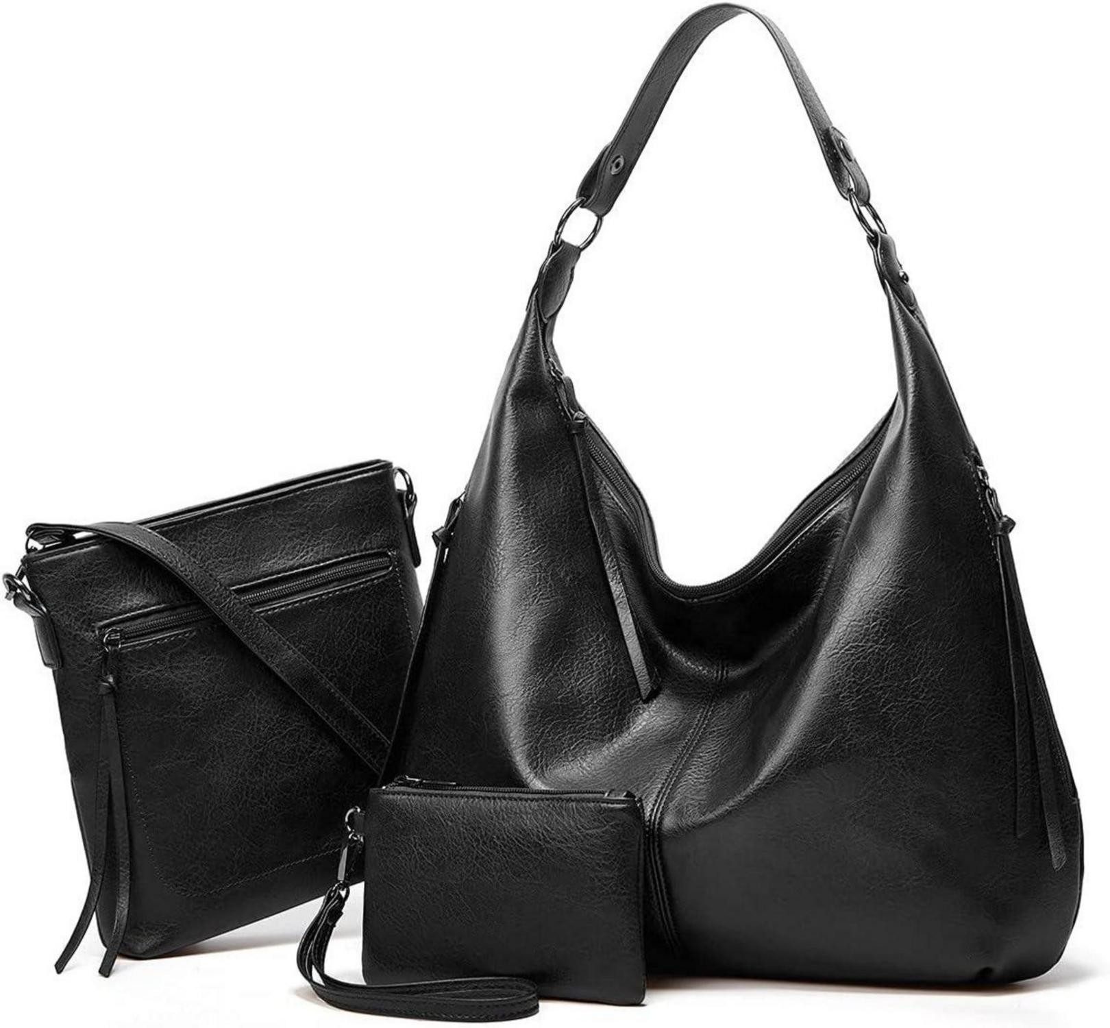 Das Set besteht aus einer Handtasche, einer Umhängetasche und einer Geldbörse. Die Handtasche bietet mit Abmessungen von 48cm x 9 cm x 35 cm ausreichend Platz für alle Ihre Notwendigkeiten. Die Umhängetasche misst 24cm x 5,5 cm x 25 cm und die Geldbörse kommt auf 17cm x 1 cm x 12 cm. Dank des abnehmbaren Schultergurts können Sie die Tasche ganz nach Ihren Wünschen als Umhängetasche oder Crossbody-Tasche tragen.