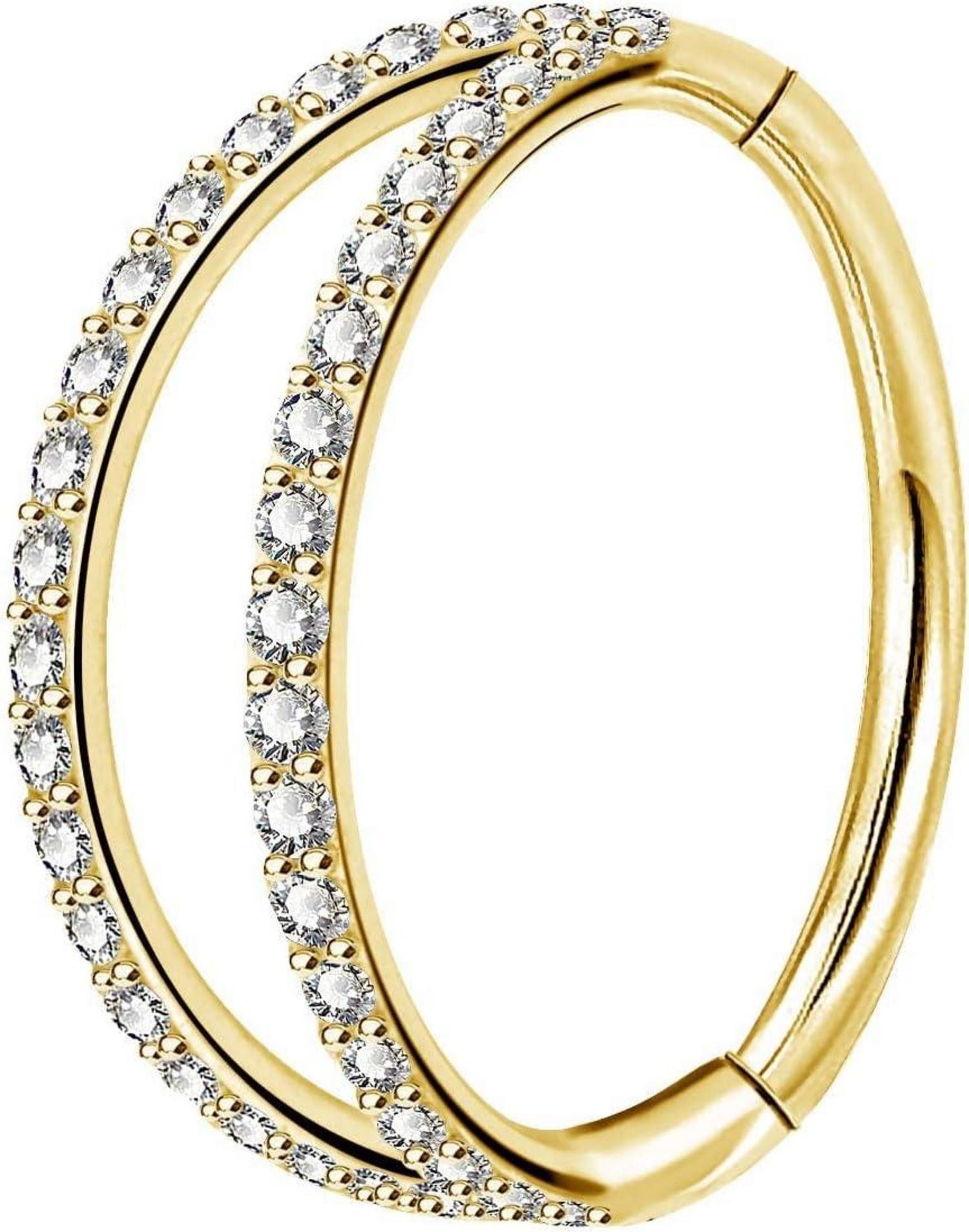 The Helix Earrings Hoop Double Line Clear CZ Paved Septum Ring Cartilage Earrings are a magnificent piece of jewelry that exudes elegance and style. Made of high-quality 316L Surgical Stainless Steel and adorned with AAA Grade Shiny CZ, these earrings are not only shiny and elegant but also hypoallergenic and nickel-free, making them safe for sensitive skin.