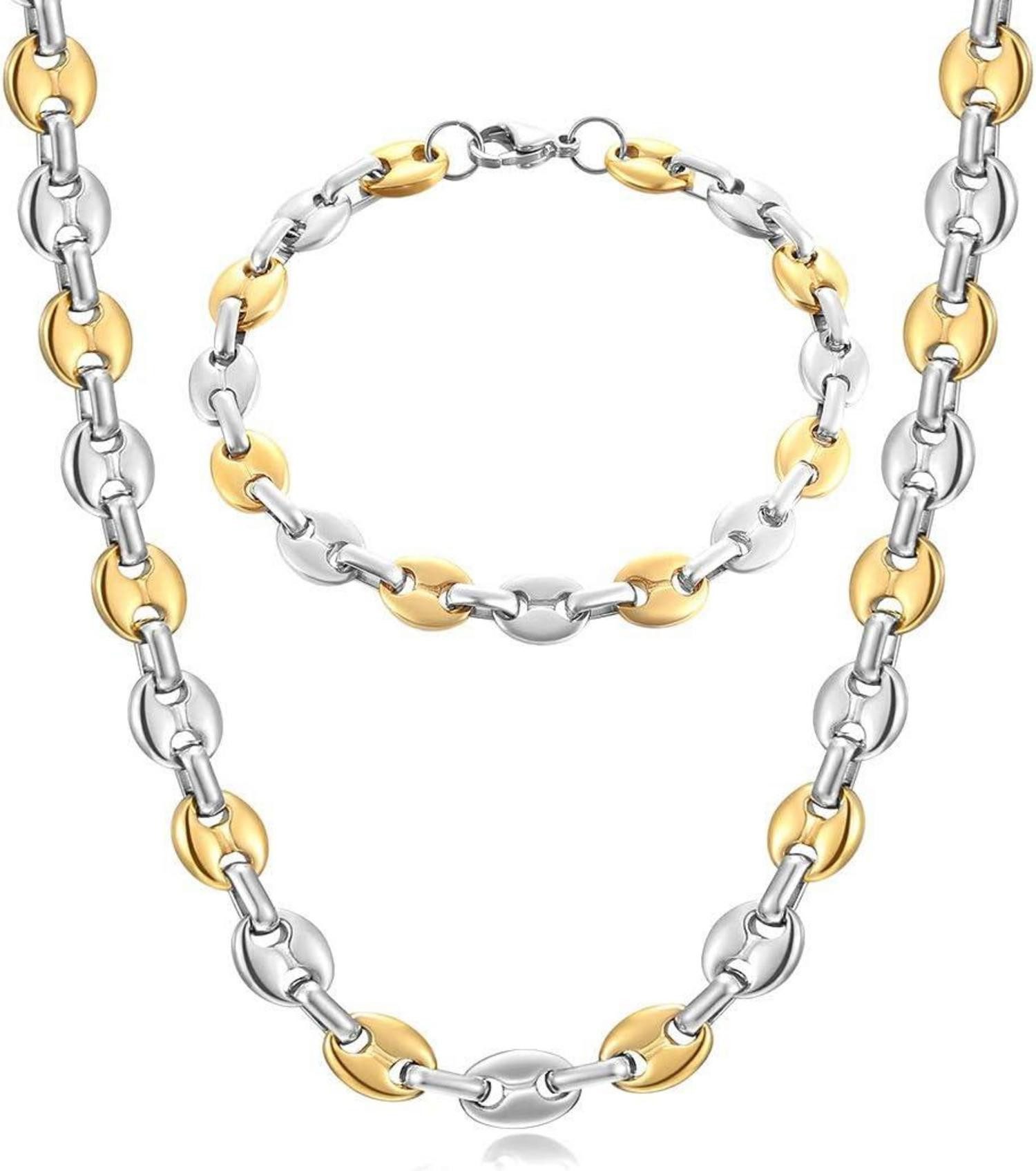 Die AFSTALR Halskette Herren Edelstahl 6/9/11mm Kaffeebohne Kette Armband Set ist ein Must-Have für Männer mit Sinn für Mode und Stil. Hergestellt aus hochwertigem Edelstahl, bietet dieses Set Halskette und Armband in einem einzigartigen Kaffeebohnen-Design. Die Farboptionen Silber, Gold und Schwarz sowie die verschiedenen Длинаn von 51cm, 56cm und 61cm ermöglichen es jedem, seinen individuellen Look zu kreieren.
