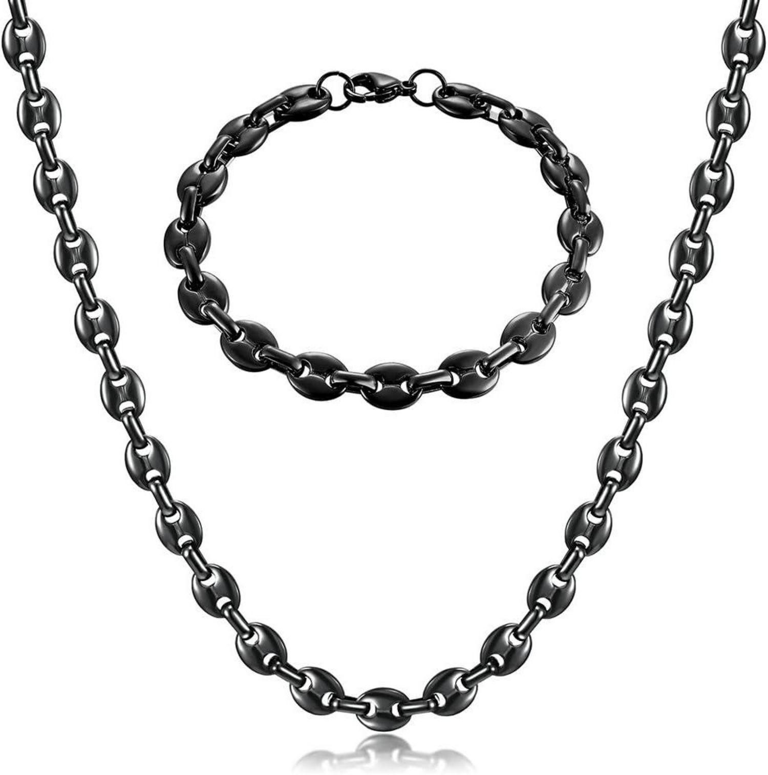 Die AFSTALR Halskette Herren Edelstahl 6/9/11mm Kaffeebohne Kette Armband Set für Männer ist eine exklusive Schmuckkollektion in Silber, Gold und Schwarz. Jedes Set besteht aus einer Kaffeebohnen-Halskette und einem passenden Armband, verpackt in einer stilvollen Geschenkbox.