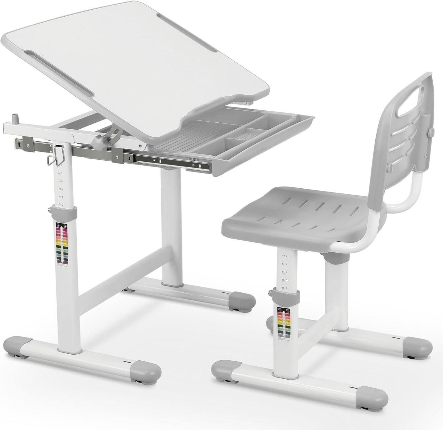 Der Schreibtisch verfügt über ausziehbare Schubladen, in denen Stifte, Bücher und andere Kleinigkeiten ordentlich aufbewahrt werden können. Die Höhenverstellbarkeit des Schreibtisches und des Stuhls macht es einfach, die perfekte Sitzposition für Ihr Kind zu finden, während es wächst. Der Metallhaken an der Kante des Schreibtisches bietet praktischen Stauraum für Schultaschen oder Wasserflaschen, um den Arbeitsbereich aufgeräumt zu halten.