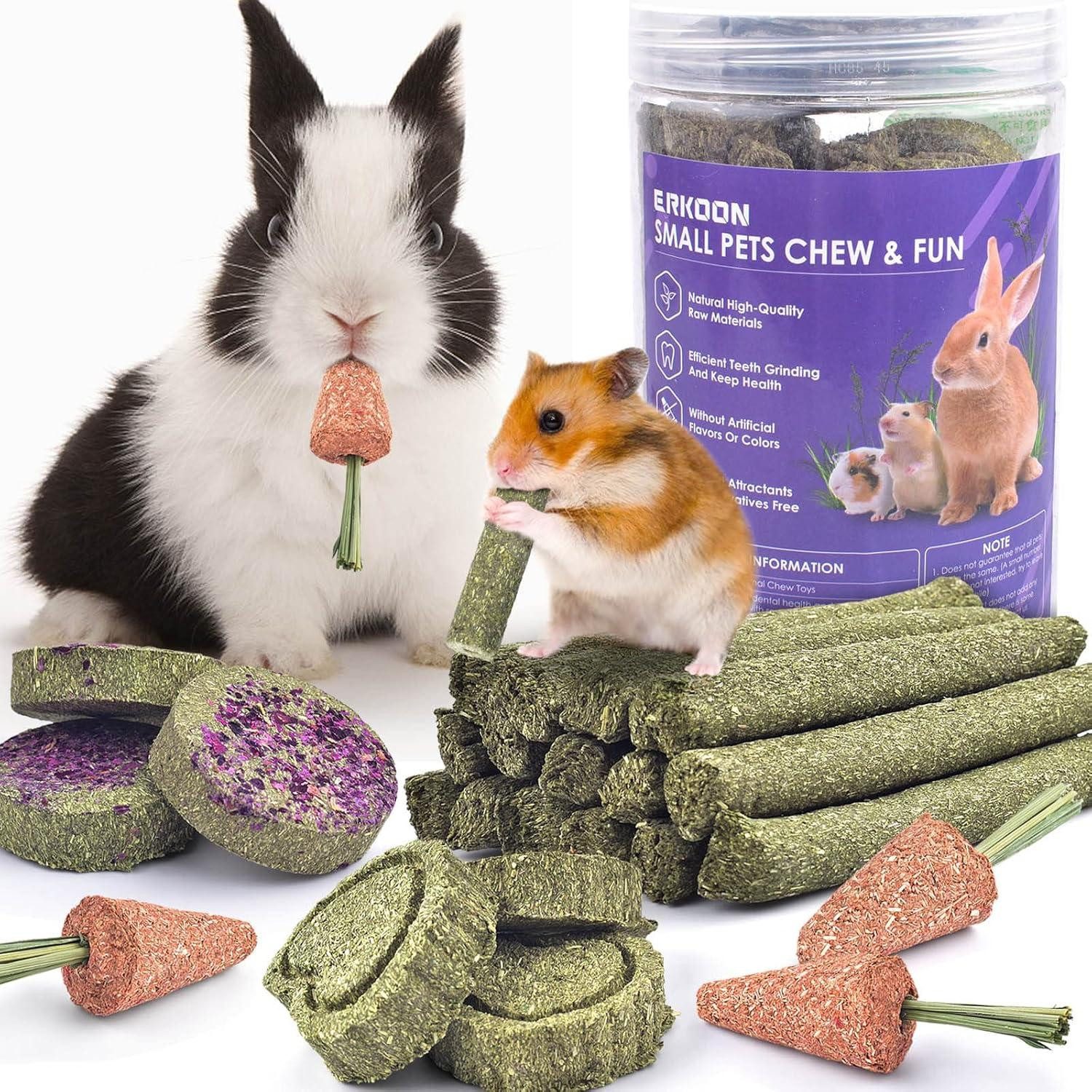 Wenn es um das Wohlergehen Ihres kleinen pelzigen Freundes geht, ist ERKOON 24 Stück Kaninchen Spielzeug die perfekte Wahl. Diese Timothy Heu Sticks, Karotten und Rosengraskuchen sind nicht nur ein Genuss für Ihr Haustier, sondern fördern auch die Zahnpflege und Molar-Gesundheit. Ihre neugierigen Kleintiere wie Kaninchen, Meerschweinchen, Hamster und Chinchillas werden von diesen Kauspielzeugen begeistert sein.