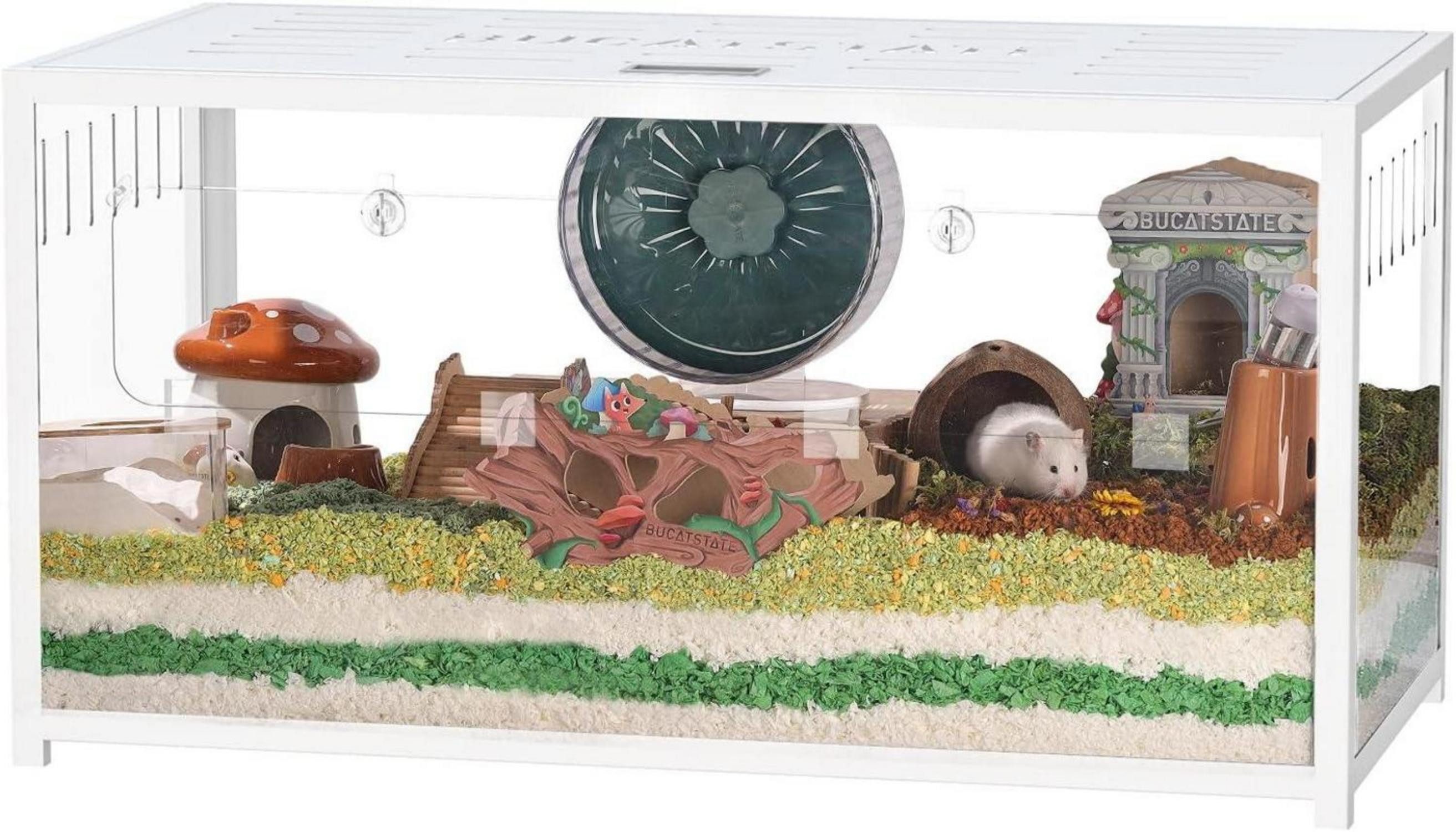 Das stapelbare Design ermöglicht es Ihnen, mehrere Käfige zu verbinden und somit Platz zu sparen. Die Metallstruktur in Kombination mit hochwertigen Acrylplatten sorgt für Stabilität und verhindert das unerwünschte Durchkauen oder Ausbrechen. Die 4 Sichtfenster bieten Ihnen die Möglichkeit, Ihre Haustiere aus jedem Winkel zu beobachten, während sie in einer natürlichen Umgebung spielen.