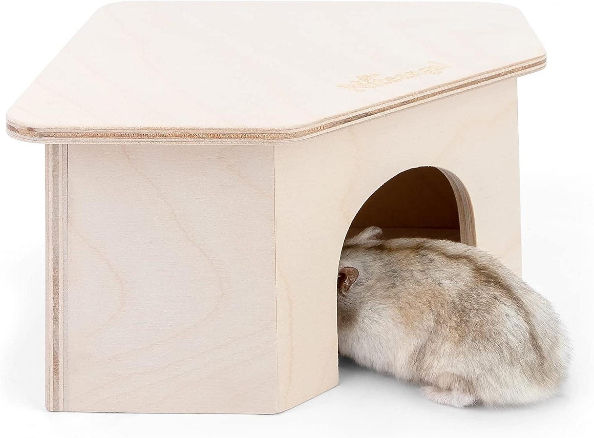 Leicht zu reinigen und Haustiere zu necken: Das bodenlose Design kann den Innenraum besser reinigen, mit Ihrem Haustier interagieren und die Bettwäsche wechseln. Ein Design, das die Haustiere kennt: Die halbgeschlossene Haustierhütte mit einer Höhle ist bequem, atmungsaktiv und gibt ein Gefühl der Sicherheit, und der Durchmesser des Eingangs beträgt ca. 5,3 cm, empfohlen für Zwerghamster, kleine Rennmäuse, Mäuse oder andere ähnlich große Haustiere. Handgefertigtes und haustierfreundliches Material - Handgefertigt aus ausgewähltem Birkensperrholz & Buchenstäbchen ohne Nägel, die gesamte Struktur ist stabil und es gibt keine Lücken auf den Kletterleitern des Daches. Jede Ecke dieses Hamsterhauses ist glatt geschliffen, bietet Ihnen ein langlebiges und kaubares Hamsterhaus und Spielzeug, hilft das Kauverlangen zu lindern und die Zähne des Haustieres zu schützen. Kreative Hamster-Habitat-Dekoration – bezaubernde und gut aussehende Cartoon-förmige Hamsterhütte aus Holz für interessante Betrachtung auf Hamsterkäfig-Dekoren, passt zu vielen Käfig-Themen. Hamsterversteck & Kletterrampe - Das Design des Übungsleiterdachs macht das Haus nicht mehr eintönig. Dies bietet nicht nur ein Versteck für kleine Haustiere, die sich an einem ruhigen und sicheren Ort verstecken, ausruhen, aufbewahren und essen können, sondern sorgt auch dafür, dass Haustiere ihre Gleichgewichtsfähigkeiten verbessern und Emotionen durch Üben und Spielen lindern und Ihrem Hammer helfen, leicht auf andere Plattformen zuzugreifen.
