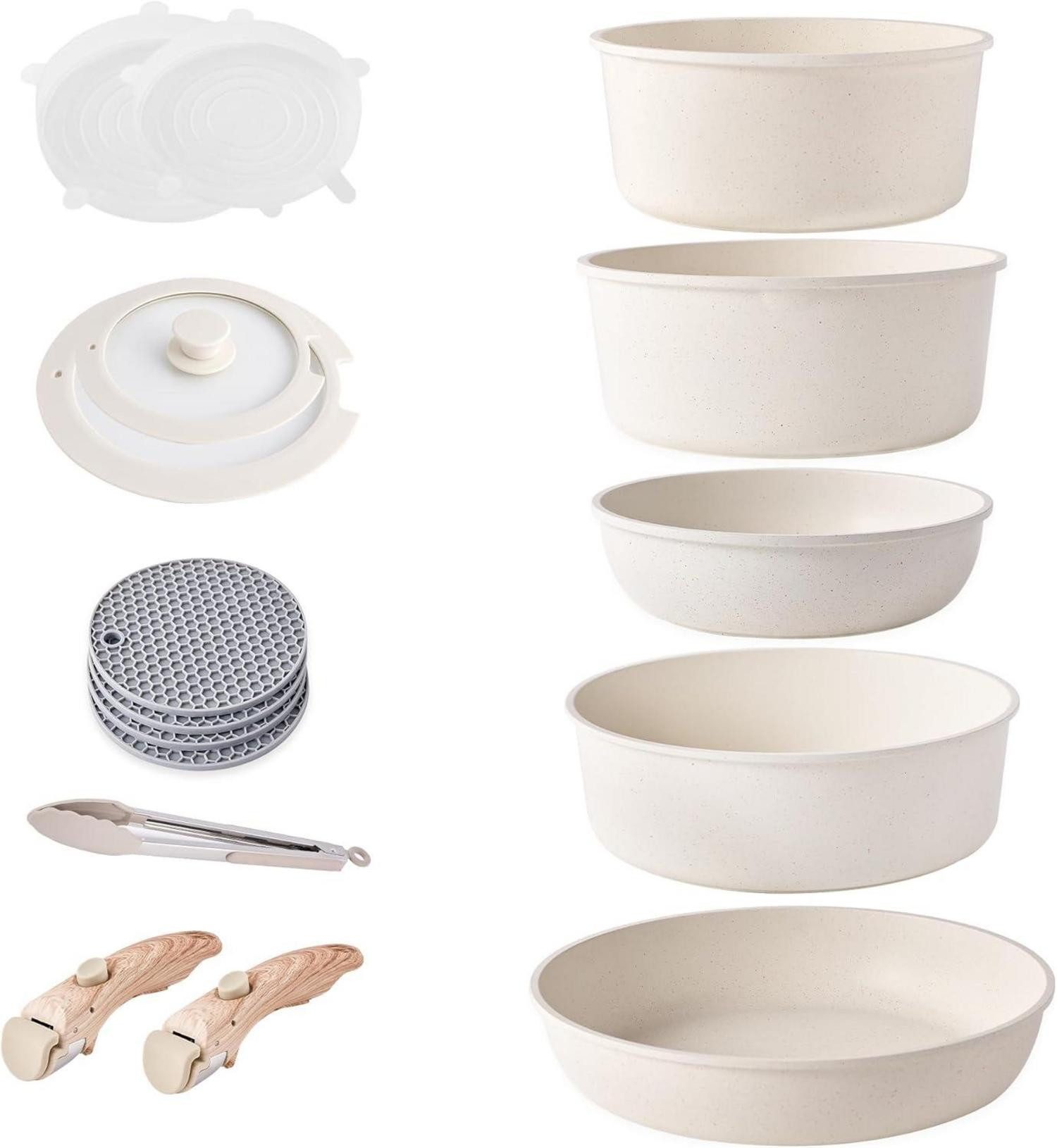 ???? Wir sind bestrebt, einen effizienten und kundenfreundlichen Service vor und nach dem Kauf zu bieten. Wenn Sie während des Einkaufs Fragen haben, wenden Sie sich bitte an uns und wir werden Ihnen detaillierte Antworten und geeignete Lösungen anbieten. Das stapelbare Design ermöglicht eine bessere Nutzung von begrenztem Platz. Für die Aufbewahrung im Kühlschrank können Sie den Kühlschrankdeckel verwenden. Eine aufgeräumte Küche und ein gesunder, umweltfreundlicher Lebensstil können gleichzeitig genossen werden. Der abnehmbare Griff ist nicht nur schön und stilvoll, sondern schützt auch besser vor Verbrennungen. (Lassen Sie ihn beim Kochen nicht über einen längeren Zeitraum angebracht, um eine Beschädigung der Griffe durch ständige Erhitzung zu vermeiden). Die natürliche und gesunde Granit-Antihaftbeschichtung ermöglicht es Ihnen, mit weniger Zeit- und Arbeitsaufwand zu kochen und zu reinigen. (Es wird empfohlen, den Boden der Pfanne nach der Reinigung von Hand zu waschen und abzutrocknen; hohe Temperaturen und Reinigungsmittel in der Spülmaschine beeinträchtigen die Lebensdauer der Granitbeschichtung). Unser Kochgeschirr hat einen Induktionsboden und ist für Induktion, Gas, Keramik, Backofen und andere Herdarten geeignet. (Bitte entfernen Sie den Deckel und die Griffe, bevor Sie es in den Ofen stellen).