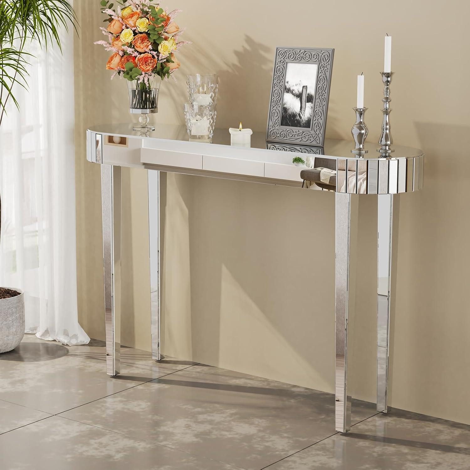 Hochwertige Verarbeitung - Der Eingangstisch ist aus silberbeschichtetem Glas und stabilem MDF gefertigt, was ihm hohe Stabilität und Langlebigkeit verleiht. Die spiegelnde Oberfläche reflektiert das Licht besonders hell und verleiht Ihrem Raum einen glamourösen Touch. Die vier quadratisch zulaufenden Beine sorgen für Stabilität und Sicherheit.