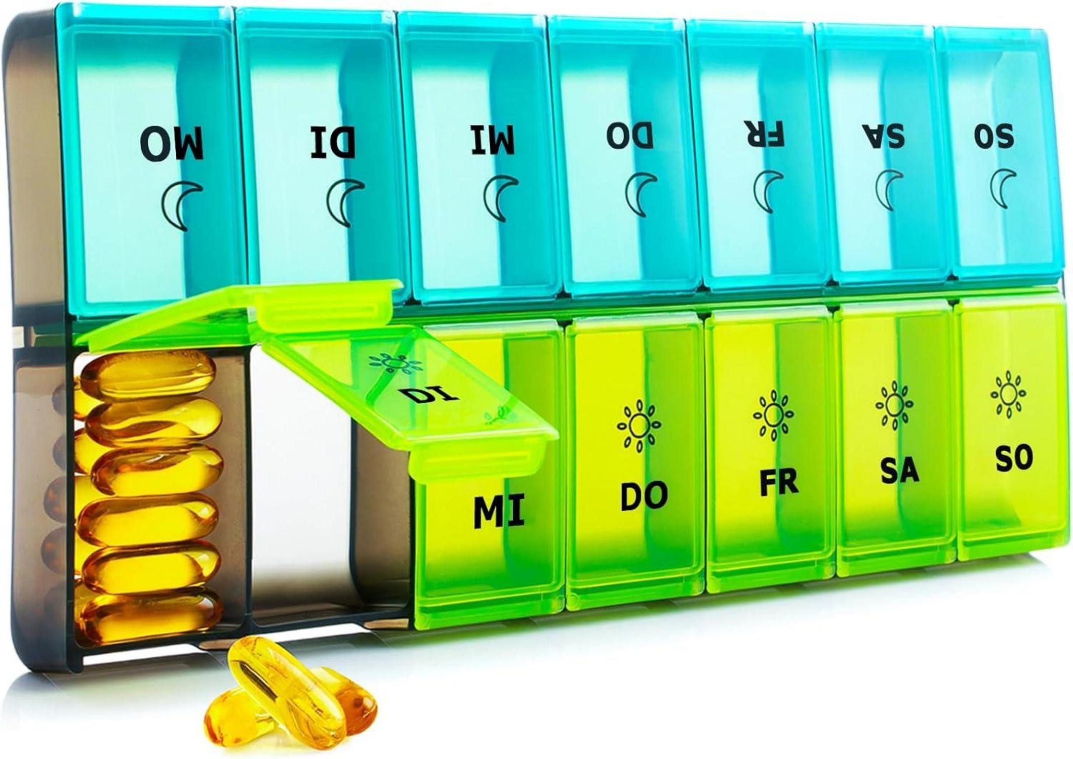 Diese Pillendose für 7 Tage morgens und abends ist BPA-frei und langlebig, hergestellt aus lebensmittelechtem PP-Kunststoff, sicher für den medizinischen Gebrauch. Die XL Große Pillendose verfügt über 14 Fächer, die verstellbar sind und somit an verschiedene Größen von Pillen, Vitaminen oder Nahrungsergänzungsmitteln angepasst werden können. Sie eignet sich auch perfekt zur Aufbewahrung von Süßigkeiten, Gummibärchen, Schaukeln und vielem mehr.Die Pillendose ist mit 3D-Drucktechnologie hergestellt und garantiert eine lange Lebensdauer von bis zu 5.000 Mal Gebrauch. Die Tablettenbox erinnert Sie zweimal täglich an die Einnahme Ihrer Medikamente, da sie Tag- und Nacht-Fächer enthält, die Ihnen helfen, Ihre täglichen Dosen zu planen. Mit extra großer Kapazität können Sie in jedem Fach bis zu 12 Fischölkapseln oder 16 große Vitamine aufbewahren. Jeder Artikel ist von Transparency verifiziert und enthält einen speziellen Code, den wir vor dem Versand überprüfen, um Ihnen absolute Sicherheit zu bieten.