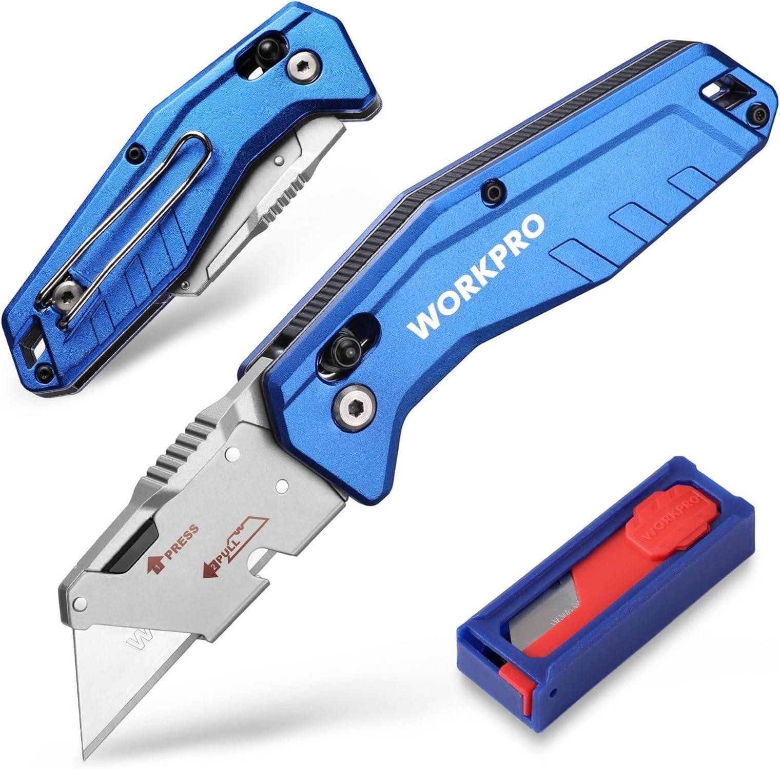 WORKPRO Klappmesser aus Aluminium, Klappbares Cuttermesser Universalmesser mit Slip Lock, Schnellwechselklinge, Schweres Teppichmesser mit 10 zusätzlichen Klingen