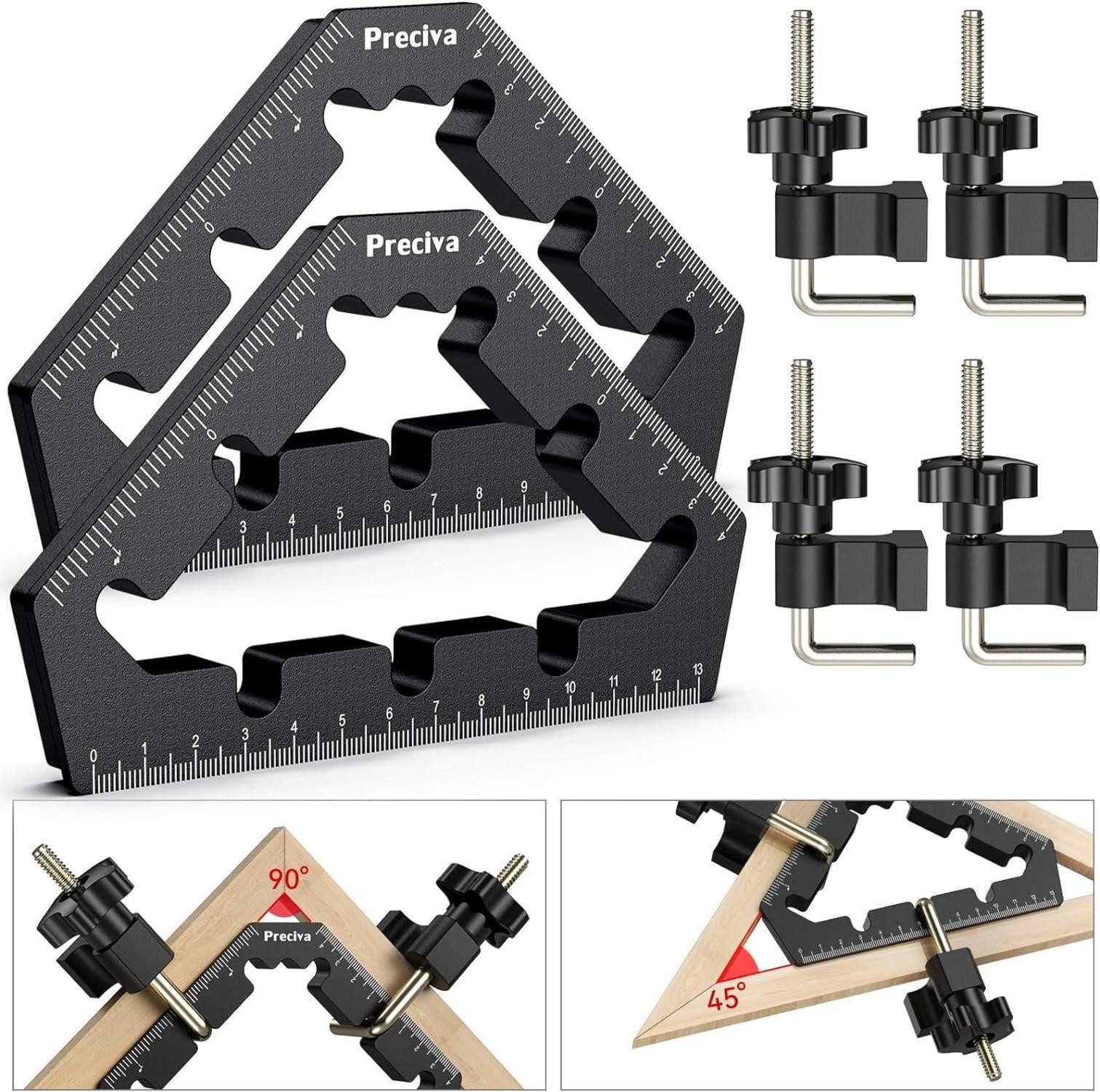 Erweiterte Artikelbeschreibung: Das Preciva Positionierwinkel-Set bietet präzise rechtwinklige Messungen und Fixierungen für Ihre Holzbearbeitungsprojekte. Mit einer Размер von 8cm/8cm/13cm und einer Kapazität von bis zu 50 mm (2 Zoll) Dicke, ist dieses Set äußerst vielseitig einsetzbar. Die rechtwinkligen Klemmen bestehen aus einer hochwertigen Aluminiumlegierung, die robust und langlebig ist. Die schwarze eloxierte Oberfläche sorgt für Rostschutz und Langlebigkeit, so dass Sie diese Werkzeuge jahrelang verwenden können. Egal ob Sie Schränke montieren, Rahmen bauen oder Möbel restaurieren, mit diesen Positionierwinkeln halten Sie stets den perfekten Winkel. Die einfache Handhabung ermöglicht es Ihnen, die Winkel schnell und präzise festzulegen, um Ihre Projekte mühelos abzuschließen. Jedes Set enthält 2 Stück 45/90-Grad-Rechtwinkliges-Dreieck-Positionierwinkel sowie jeweils 4 Stück für Basis, Boden und Befestigungsmuttern. Wählen Sie mit Preciva die richtigen Werkzeuge für Ihre Holzbearbeitung, Heimwerken und handwerklichen Projekte.