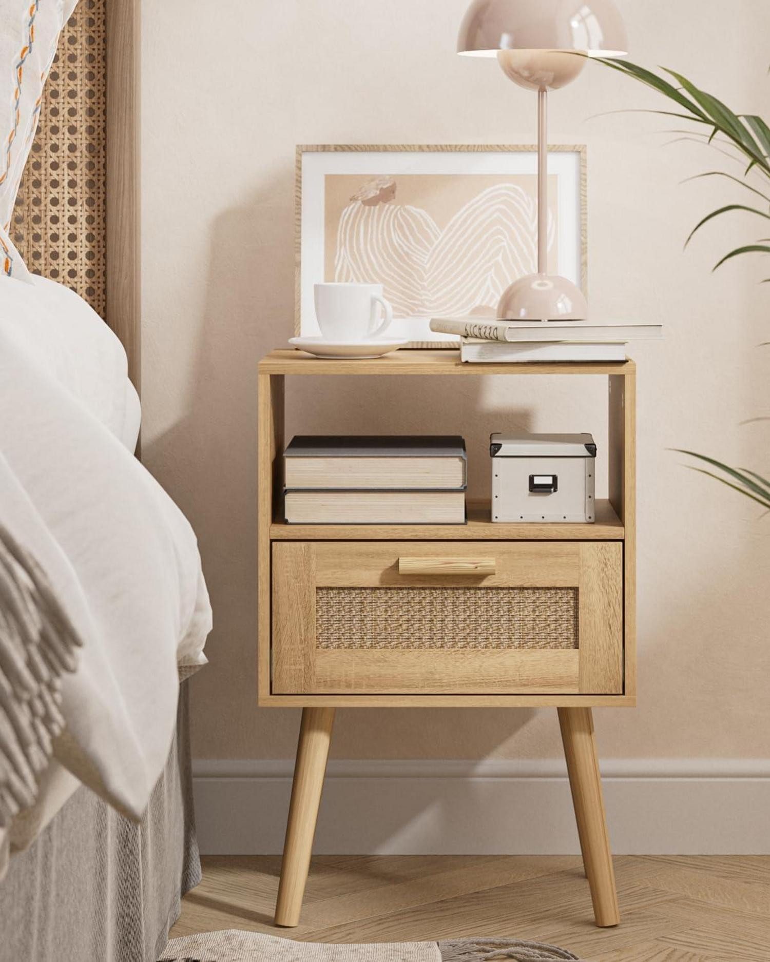 Einfach zu montieren und zu reinigen: Все Teile der Rattan Nachttische sind nummeriert, mit klaren Anweisungen und nummerierten Komponenten können Sie die Produktinstallation leicht abschließen und schnell reinigen und verwenden. Hochwertige Materialien, stark und stabil: Der Nachttisch aus Holz besteht aus hochwertiger MDF-Platte, die Schubladenoberfläche ist mit PE-Rattan gestaltet und hat Beine aus massivem Kiefernholz. Stark und robust. An der Unterseite befinden sich rutschfeste Gummipads, die Kratzer auf dem Boden verhindern und Geräusche beim Bewegen reduzieren. Einfache Montage und Reinigung: Все Teile des Rattan-Nachttisches sind nummeriert, mit klaren Anweisungen und nummerierten Komponenten können Sie die Produktinstallation einfach abschließen und ihn schnell reinigen und verwenden. Multi-Szenario Verwendung: Dieser Beistelltisch hat zwei Schubladen, die Stauraum für Ihre Schreibtischlampe, Fernbedienung und Mobiltelefon bieten. Einzigartige Rattan Rand Textur, ist es das beste Geschenk für Ihre Verwandten und Freunde. Großer Stauraum: Die Размер dieses Beistelltisches ist 15.6" x 11.8" x 23.4": kompakte Größe, großer Stauraum macht den kleinen Nachttisch ideal für kleine Räume, geeignet für Schlafzimmer, Wohnzimmer und Schreibtische. Rattan Nachttisch im Bauernhaus-Stil: Dieser Nachttisch besteht aus einem holzfarbenen Gestell und fein handgefertigten Rattan Schubladenflächen. Es verwendet reine Töne, um einen natürlichen und warmen Bohème-Stil zu umreißen, und es wird Sie durch jeden frischen Morgen begleiten.