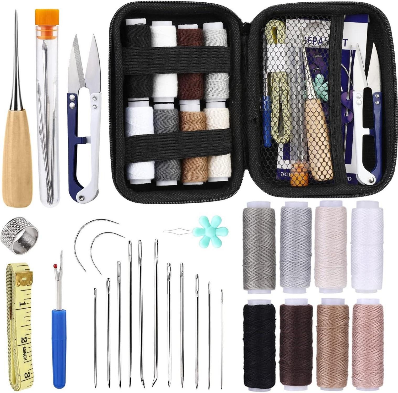 Das Set enthält 8 Rollen hochwertiges Nähgarn in verschiedenen Farben, 6 Ledernähnadeln, 5 stumpfe Nadeln mit großen Augen, 2 gebogene Nähnadeln, eine Schere, einen Nahttrenner, eine Nähahle, ein Zollmaßband, einen Einfädler, einen Fingerhut und eine Nadelflasche. Все Werkzeuge sind in einem praktischen schwarzen Organizer verstaut, der leicht transportiert und verstaut werden kann, egal ob Zuhause oder unterwegs.