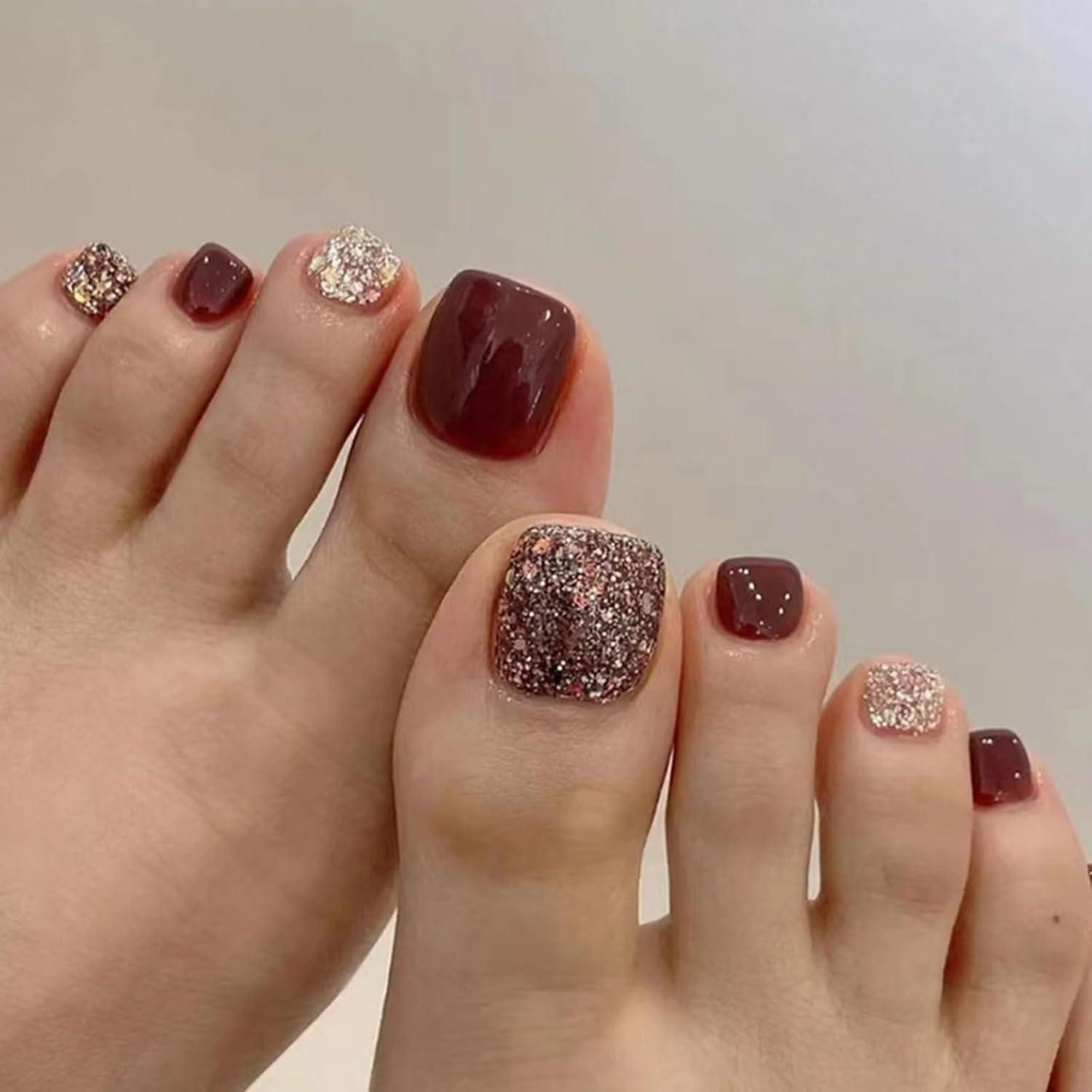 Diese falschen Zehennägel sind die perfekte Ergänzung für Ihr Outfit. Das weinrote Glitzerdesign verleiht Ihren Zehen einen glamourösen Look, der Ihre Persönlichkeit unterstreicht. Die einfache Anwendung ermöglicht es Ihnen, Zeit und Geld zu sparen, im Vergleich zu teuren Besuchen im Nagelstudio.