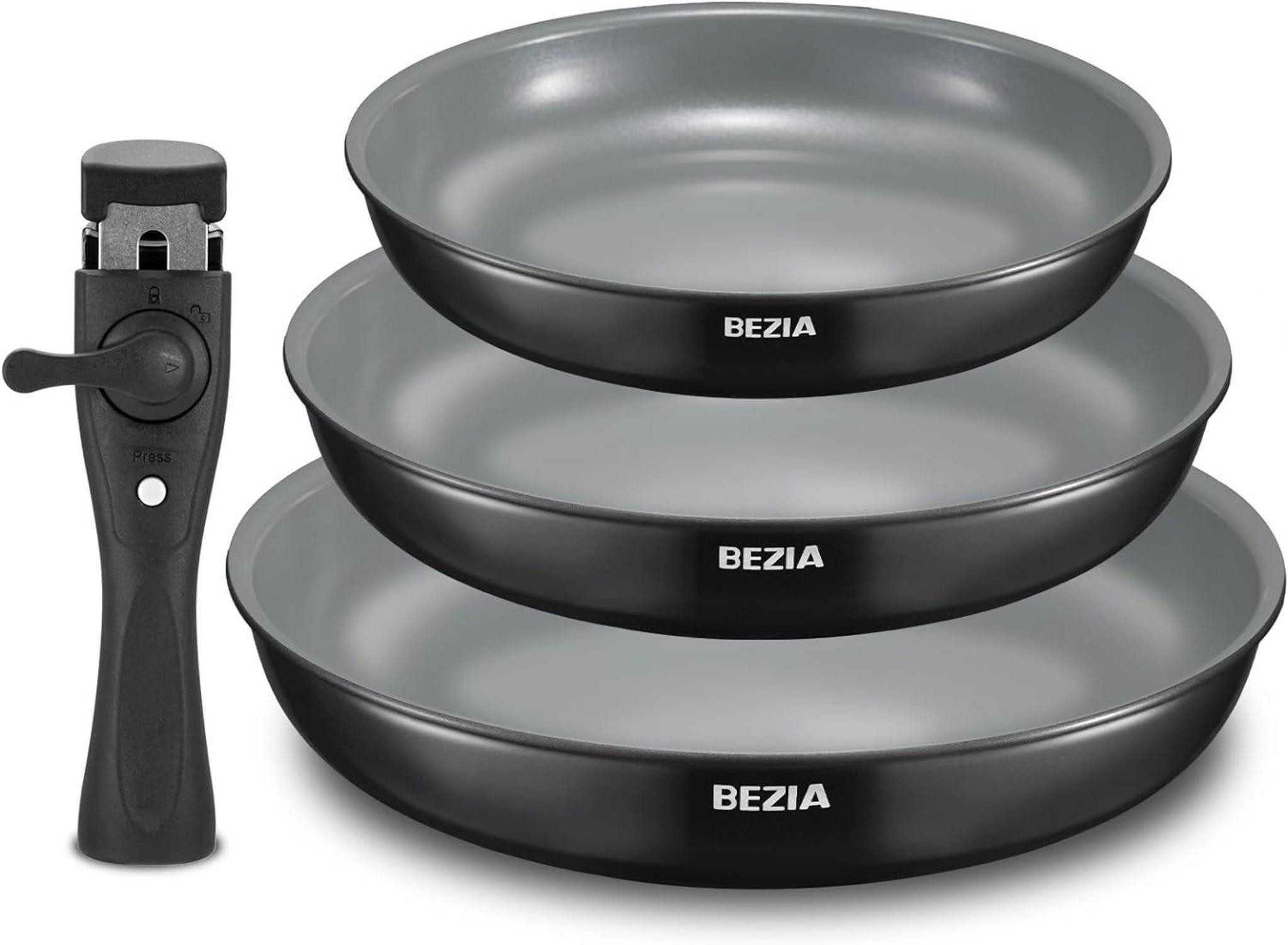 Das Aufräumen ist ein Kinderspiel! Da es keine versteckten Lücken gibt, wischen Sie sie einfach mit einem Papiertuch ab oder spülen Sie sie mit Wasser ab. Unser Kochgeschirr ist für zusätzlichen Komfort auch spülmaschinenfest. Sparen Sie mit unserem innovativen Design Platz in Ihrer Küche. Die abnehmbaren Griffe ermöglichen ein kompaktes Ineinanderstapeln, wodurch 75 % Ihres Schrankraums optimiert werden und eine saubere und ordentliche Kochumgebung entsteht. Diese aus recyceltem Aluminium gefertigten Pfannen haben einen erweiterten und verstärkten Boden für eine gleichmäßige Wärmeverteilung. Keine heißen Stellen oder ungleichmäßiges Kochen mehr! Der abnehmbare Griff verfügt über eine doppelte Sicherheitseinstellung und lässt sich leicht anbringen und abnehmen. Er trägt bis zu 10 kg. Nehmen Sie den Griff für die Verwendung im Ofen bis zu 240℃ ab. Dies bietet Ihnen mehr Koch- und Backmöglichkeiten und ermöglicht den nahtlosen Wechsel vom Herd zum Ofen und zum Tisch. Dieses Set ist mit allen Herdarten kompatibel, einschließlich Gas-, Elektro-, Halogen-, Keramik- und Induktionskochfeldern, und bietet Flexibilität für jede Kücheneinrichtung. Unser Kochgeschirr-Set bietet ein gesundes und antihaftbeschichtetes Kocherlebnis. Die natürliche Keramikbeschichtung ist frei von schädlichen Chemikalien wie PFAS und gewährleistet so Ihre Sicherheit und Gesundheit. Die dreischichtige Struktur verbessert die Antihaftwirkung, sodass sich Lebensmittel ganz leicht lösen und Sie weniger Öl für gesünderes Kochen verwenden können.