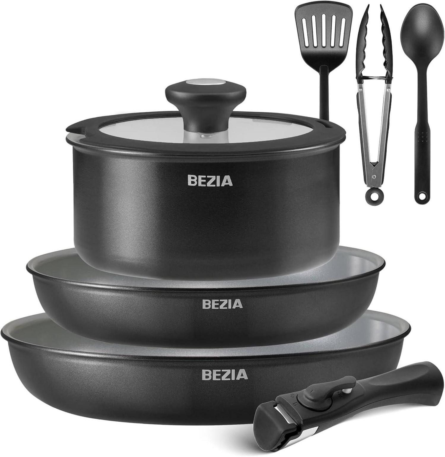 Das Aufräumen ist ein Kinderspiel! Da es keine versteckten Lücken gibt, wischen Sie sie einfach mit einem Papiertuch ab oder spülen Sie sie mit Wasser ab. Unser Kochgeschirr ist für zusätzlichen Komfort auch spülmaschinenfest. Sparen Sie mit unserem innovativen Design Platz in Ihrer Küche. Die abnehmbaren Griffe ermöglichen ein kompaktes Ineinanderstapeln, wodurch 75 % Ihres Schrankraums optimiert werden und eine saubere und ordentliche Kochumgebung entsteht. Diese aus recyceltem Aluminium gefertigten Pfannen haben einen erweiterten und verstärkten Boden für eine gleichmäßige Wärmeverteilung. Keine heißen Stellen oder ungleichmäßiges Kochen mehr! Der abnehmbare Griff verfügt über eine doppelte Sicherheitseinstellung und lässt sich leicht anbringen und abnehmen. Er trägt bis zu 10 kg. Nehmen Sie den Griff für die Verwendung im Ofen bis zu 240℃ ab. Dies bietet Ihnen mehr Koch- und Backmöglichkeiten und ermöglicht den nahtlosen Wechsel vom Herd zum Ofen und zum Tisch. Dieses Set ist mit allen Herdarten kompatibel, einschließlich Gas-, Elektro-, Halogen-, Keramik- und Induktionskochfeldern, und bietet Flexibilität für jede Kücheneinrichtung. Dieses 9-teilige Mehrzweck-Set umfasst: 1 Kochtopf (18 cm), 2 Bratpfannen (24 und 26 cm), 1 abnehmbare Griffe, 1 Silikondeckel, 1 Verschlussdeckel für einfache Lagerung oder Aufbewahrung im Kühlschrank, 3 Küchenutensilien aus Silikon, die Ihnen das Kochen erleichtern. Unser Kochgeschirr-Set bietet ein gesundes und antihaftbeschichtetes Kocherlebnis. Die natürliche Keramikbeschichtung ist frei von schädlichen Chemikalien wie PFAS und gewährleistet so Ihre Sicherheit und Gesundheit. Die dreischichtige Struktur verbessert die Antihaftwirkung, sodass sich Lebensmittel ganz leicht lösen und Sie weniger Öl für gesünderes Kochen verwenden können.