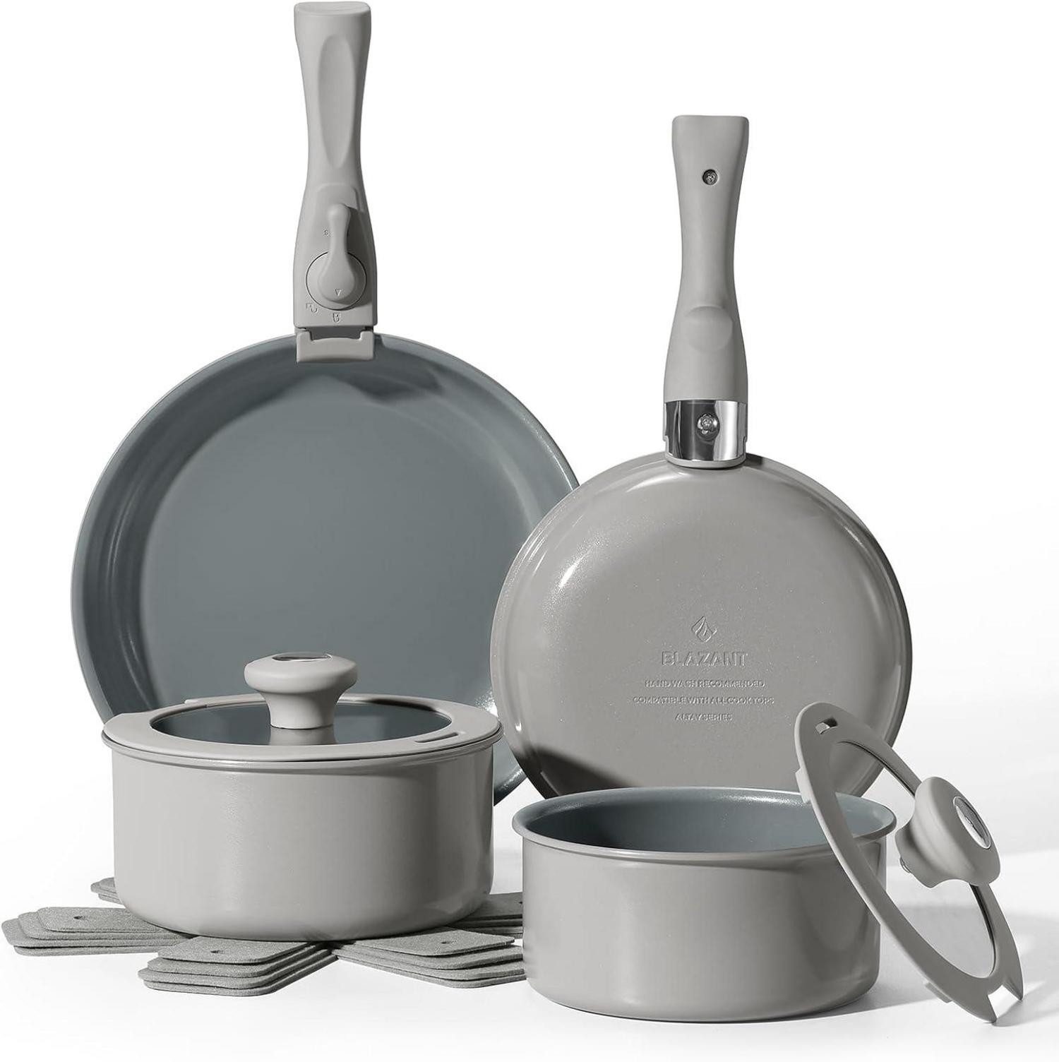 Das BLAZANT Pfannenset mit abnehmbaren Griffen ist ein 14-teiliges Mehrzweck-Set, das in keiner Küche fehlen darf. Enthalten sind 2 Kochtöpfe (16 und 18 cm), 2 Bratpfannen (20 und 26 cm), 2 Silikondeckel (16 und 18 cm), 2 Aufbewahrungsdeckel (16 und 18 cm), 2 abnehmbare Griffe und 4 Pfannenschützer.
